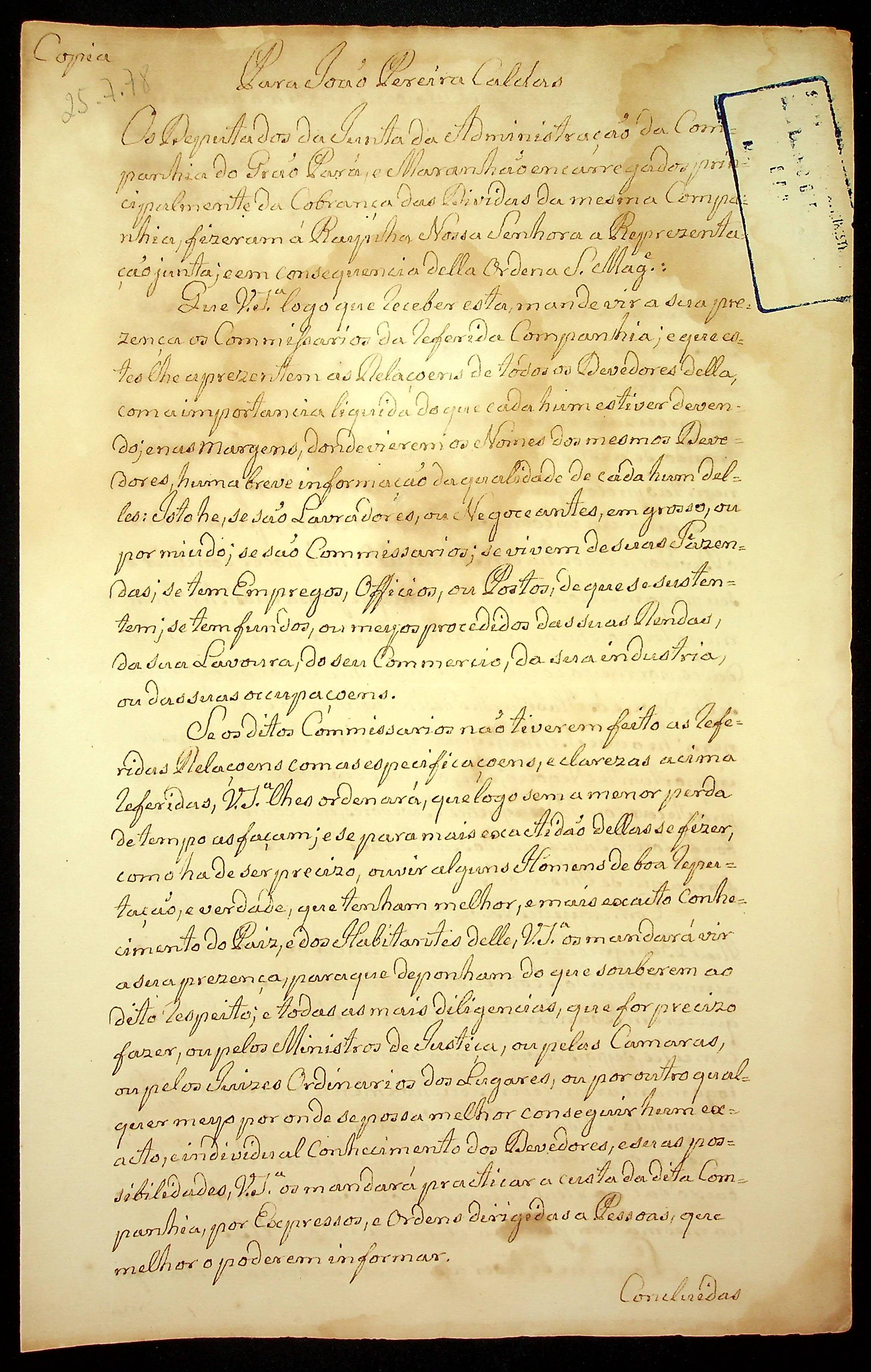 CARTA (cópia) de Martinho de Melo e Castro a João Pereira Caldas.