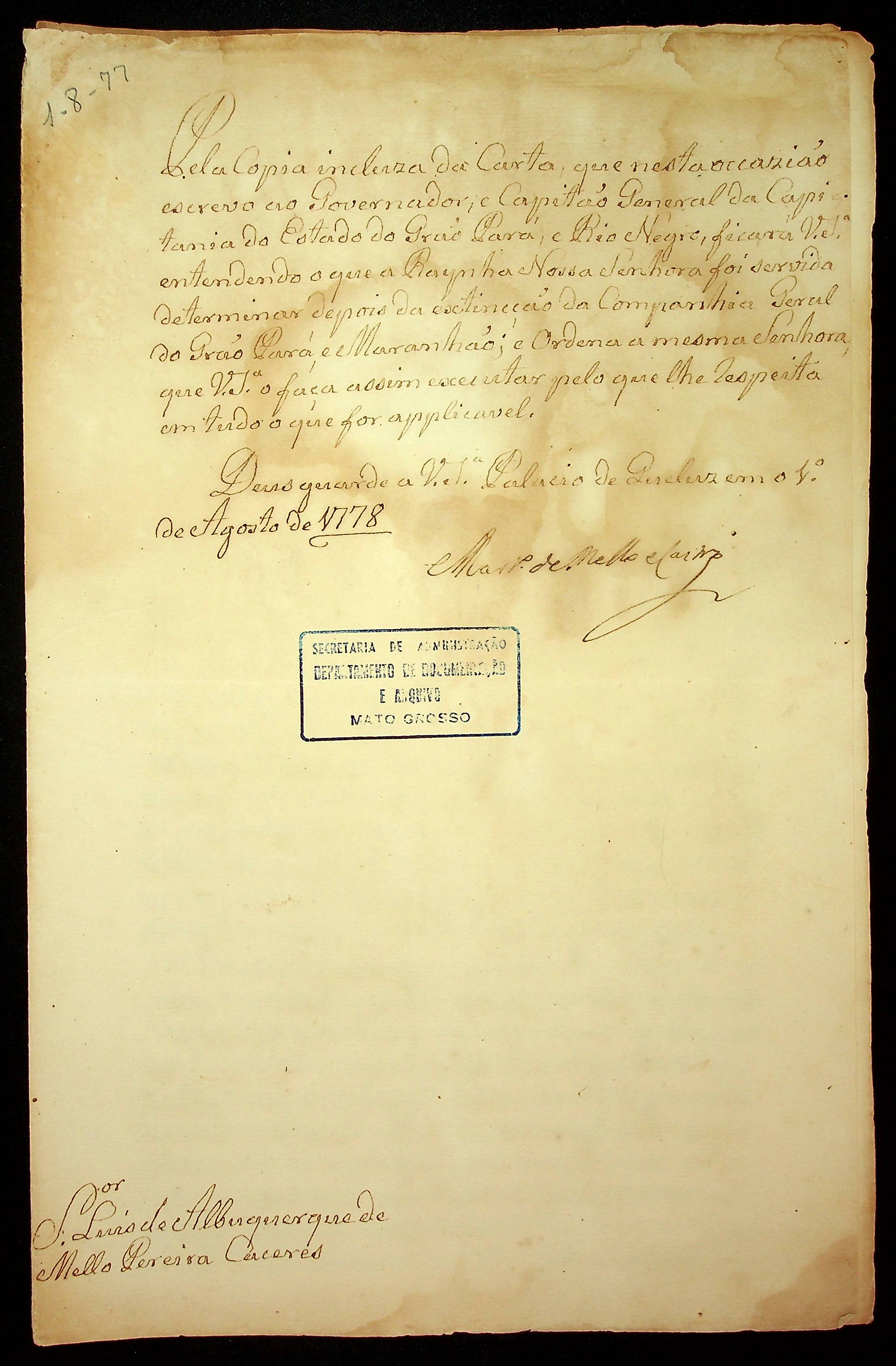 CARTA de Martinho de Mello Castro ao Governador e Capitão-General da Capitania de Mato Grosso Luiz de Albuquerque de Melo Pereira e Cáceres.