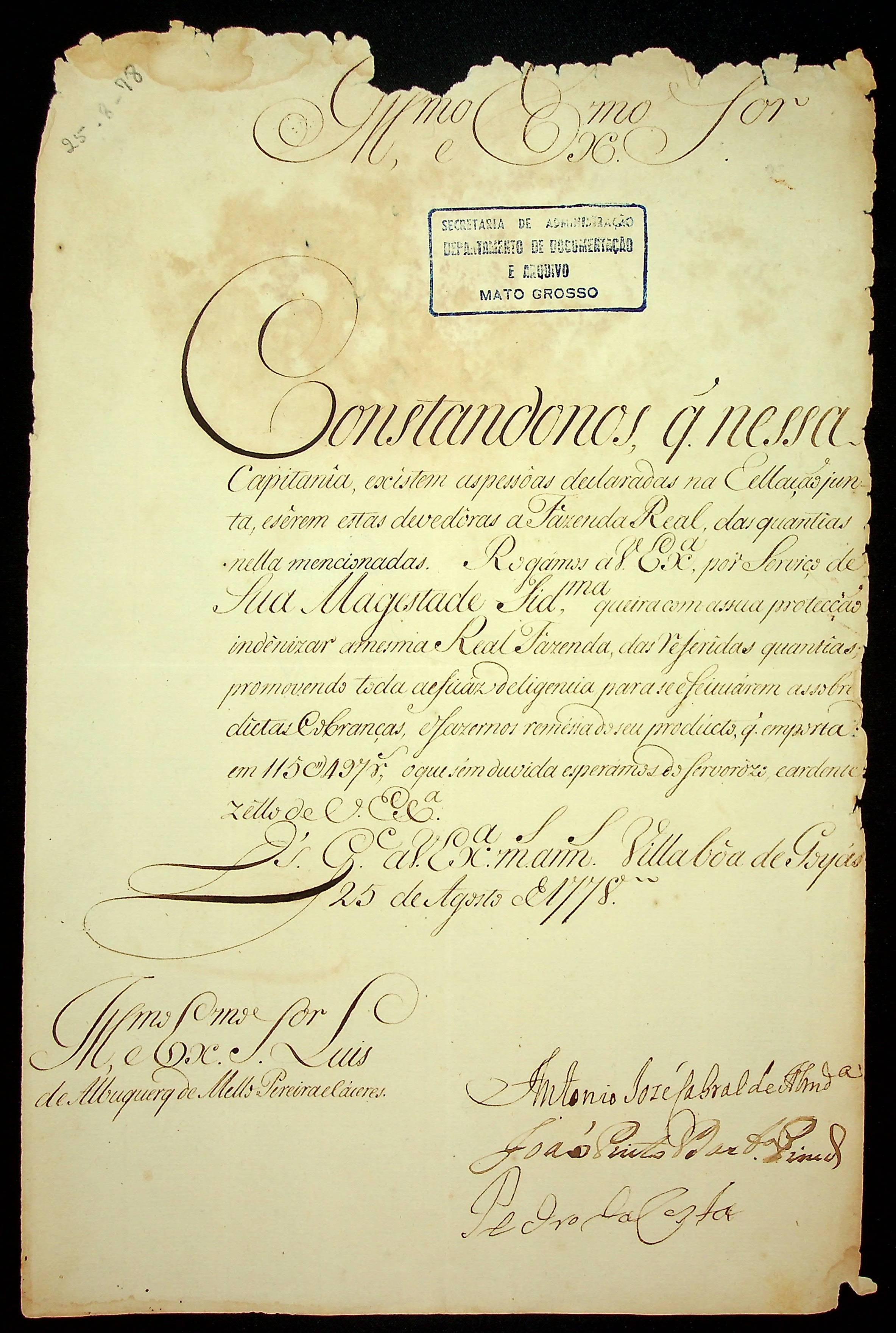 CARTA de Antônio José Cabral de Almeida, João Pinto [...] e Pedro da Costa ao [Governador e Capitão-General da Capitania de Mato Grosso] Luiz de Albuquerque de Melo Pereira e Cáceres.