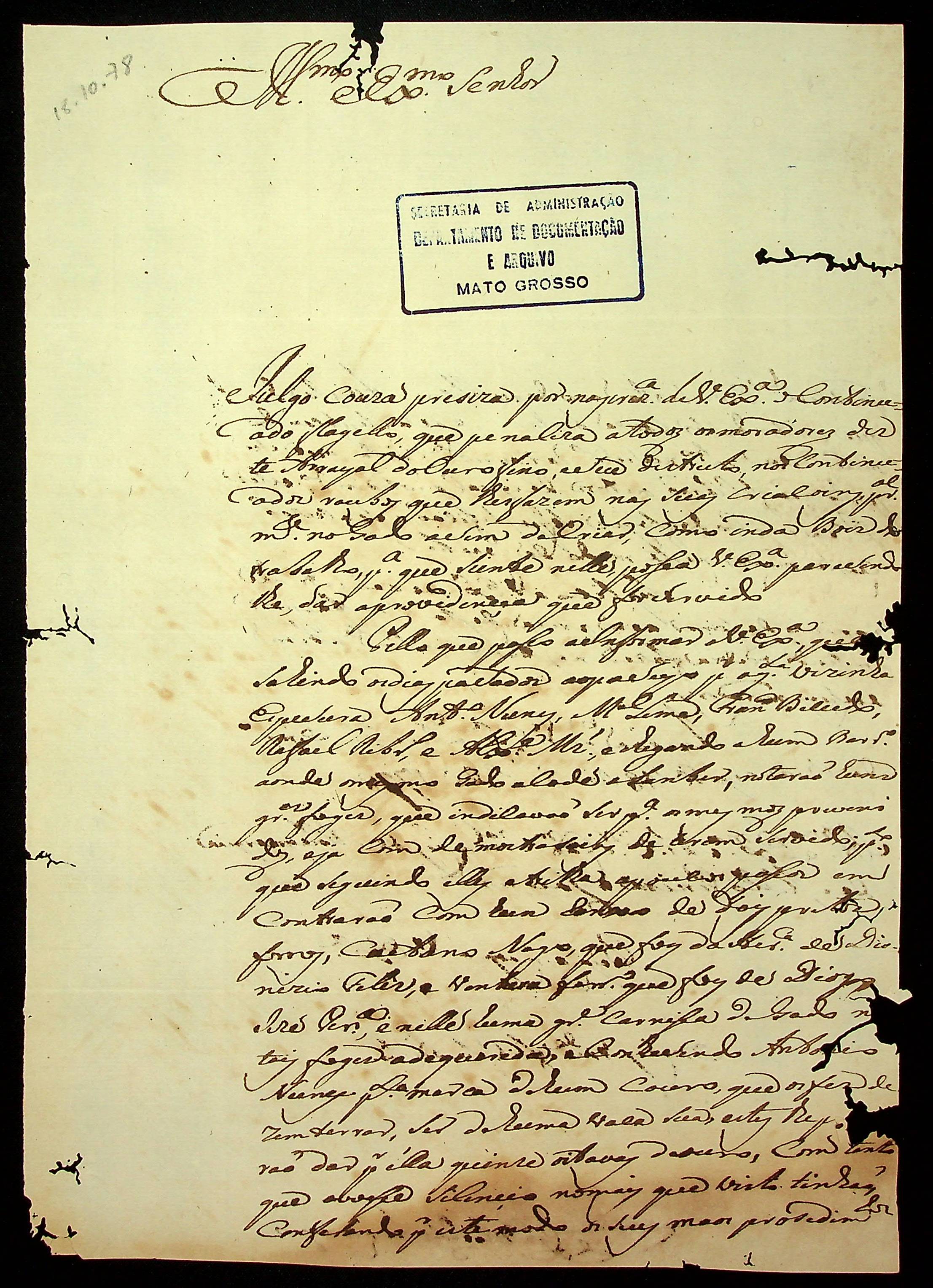 CARTA de Ignácio Vito Roiz de Sampaio ao [Governador e Capitão-General da Capitania de Mato Grosso] Luiz de Albuquerque de Melo Pereira e Cáceres.