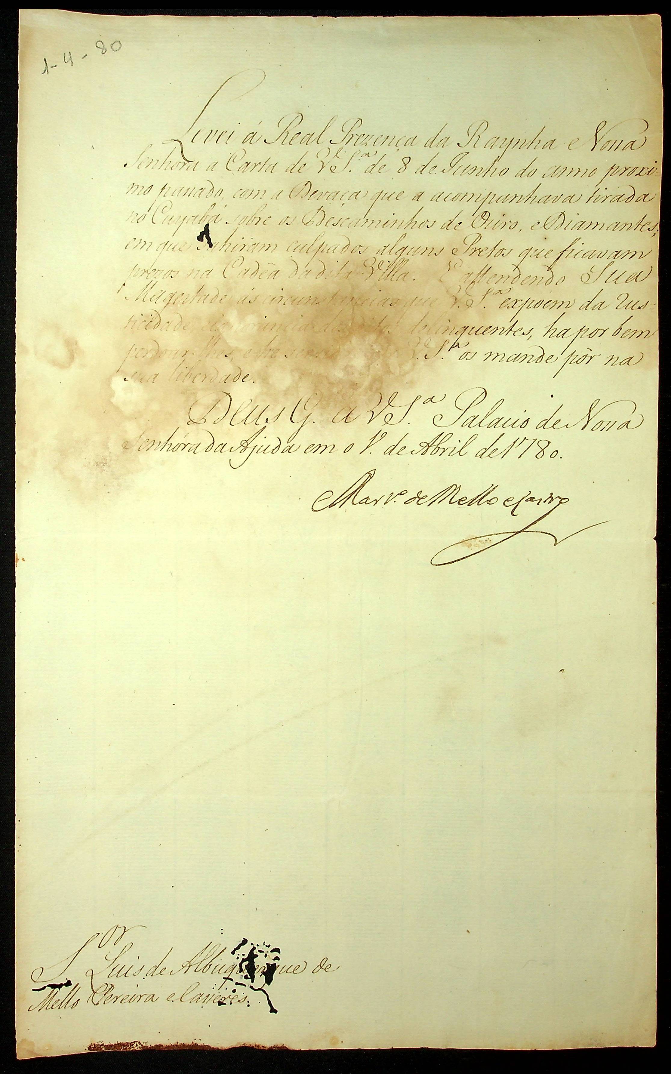 CARTA do [Secretário de Estado da Marinha e Ultramar] Martinho de Melo e Castro ao [Governador e Capitão-General da Capitania de Mato Grosso] Luiz de Albuquerque de Melo Pereira e Cáceres.