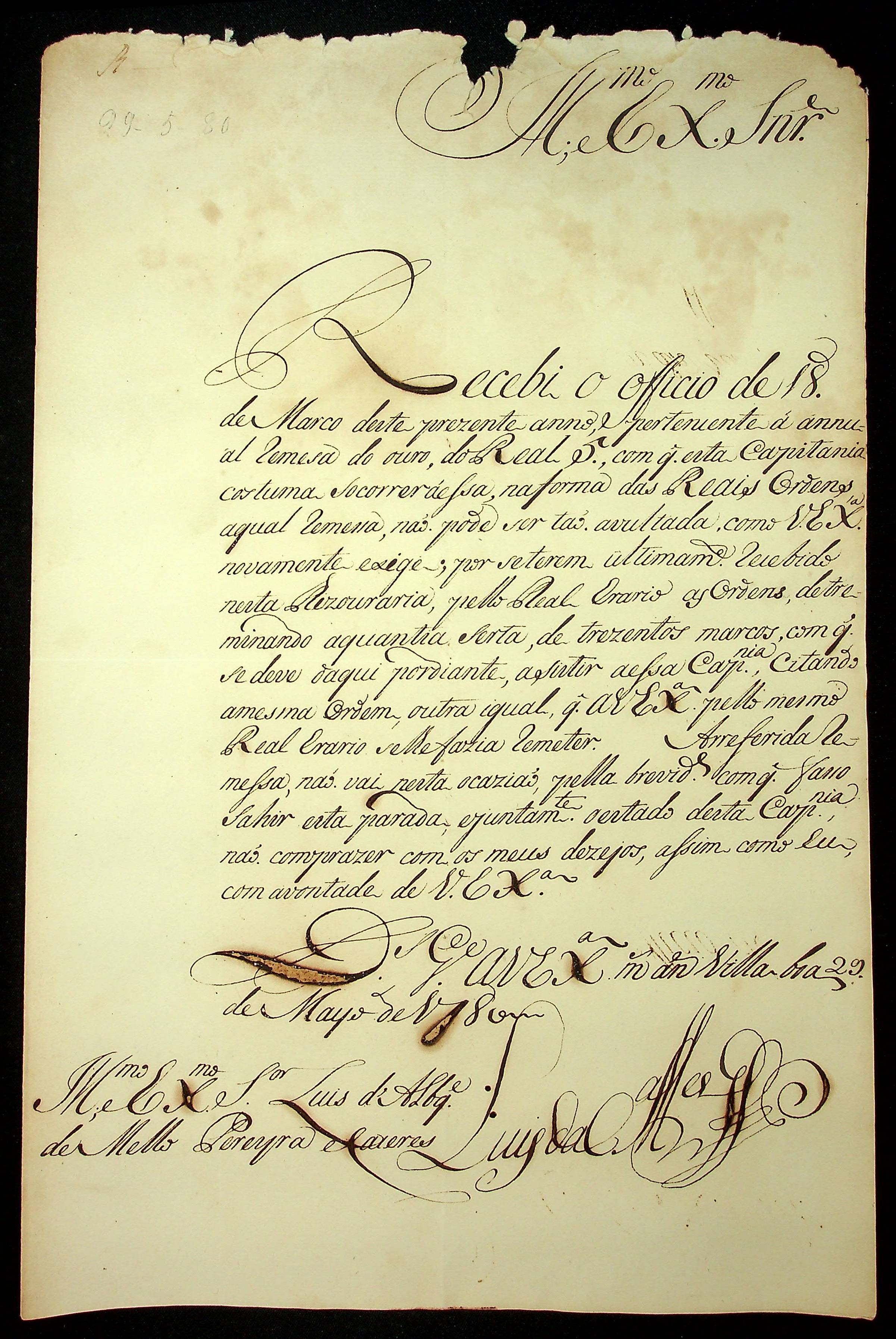 CARTA do [Governador e Capitão-General da Capitania de Goiás Luiz da Cunha Menezes] ao [Governador e Capitão-General da Capitania de Mato Grosso] Luiz de Albuquerque de Melo Pereira e Cáceres.