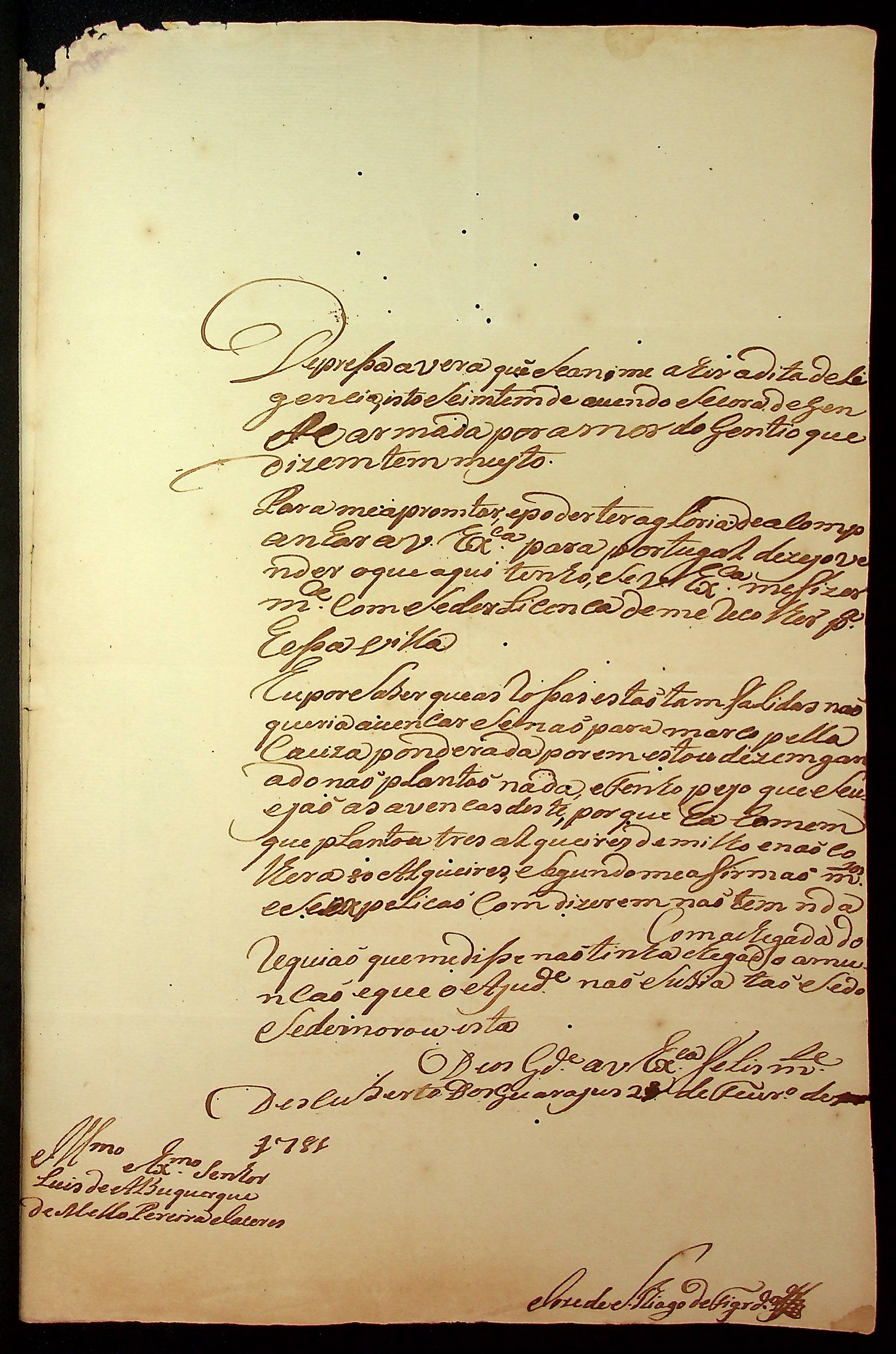 CARTA de José de Santiago de Figueiredo ao [Governador e Capitão-General da Capitania de Mato Grosso] Luiz de Albuquerque de Melo Pereira e Cáceres.