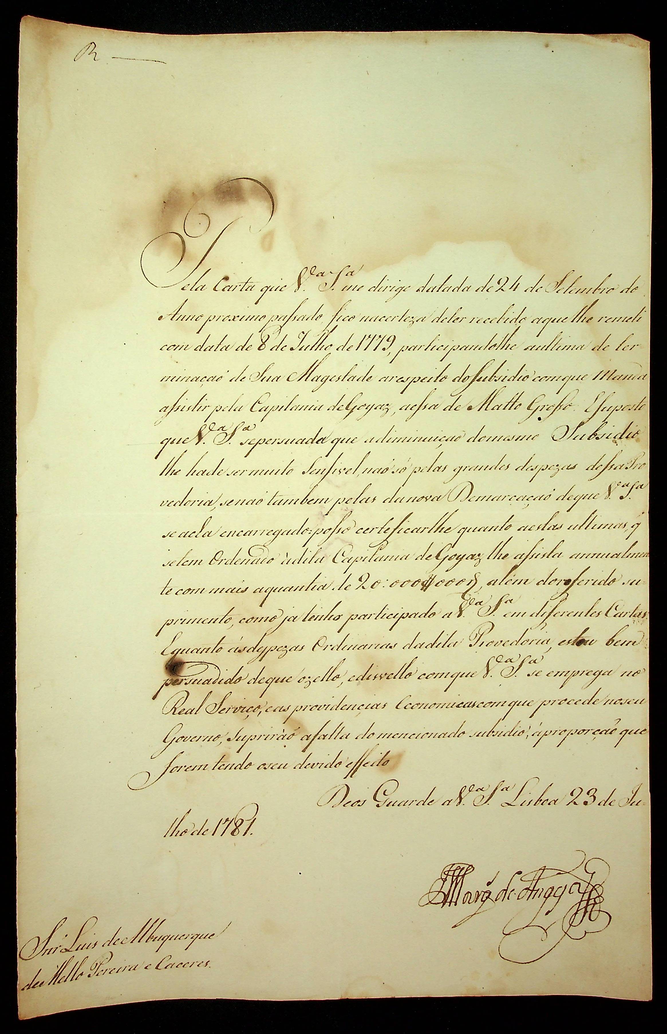 CARTA do Marquês de Angya ao [Governador e Capitão-General da Capitania de Mato Grosso] Luiz de Albuquerque de Melo Pereira e Cáceres.
