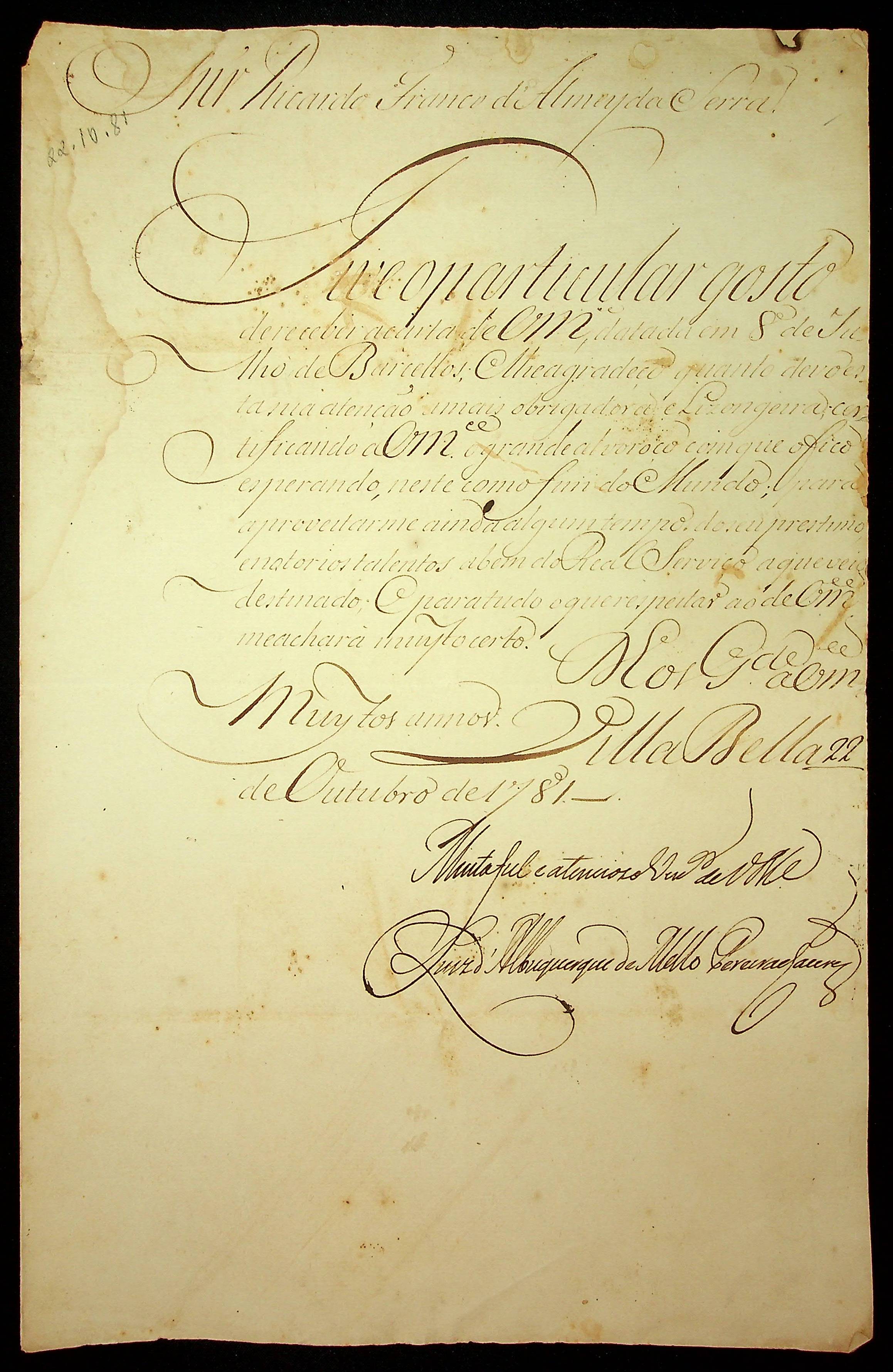 CARTA do [Governador e Capitão-General da Capitania de Mato Grosso] Luiz de Albuquerque de Melo Pereira e Cáceres à Ricardo Franco de Almeida Serra.