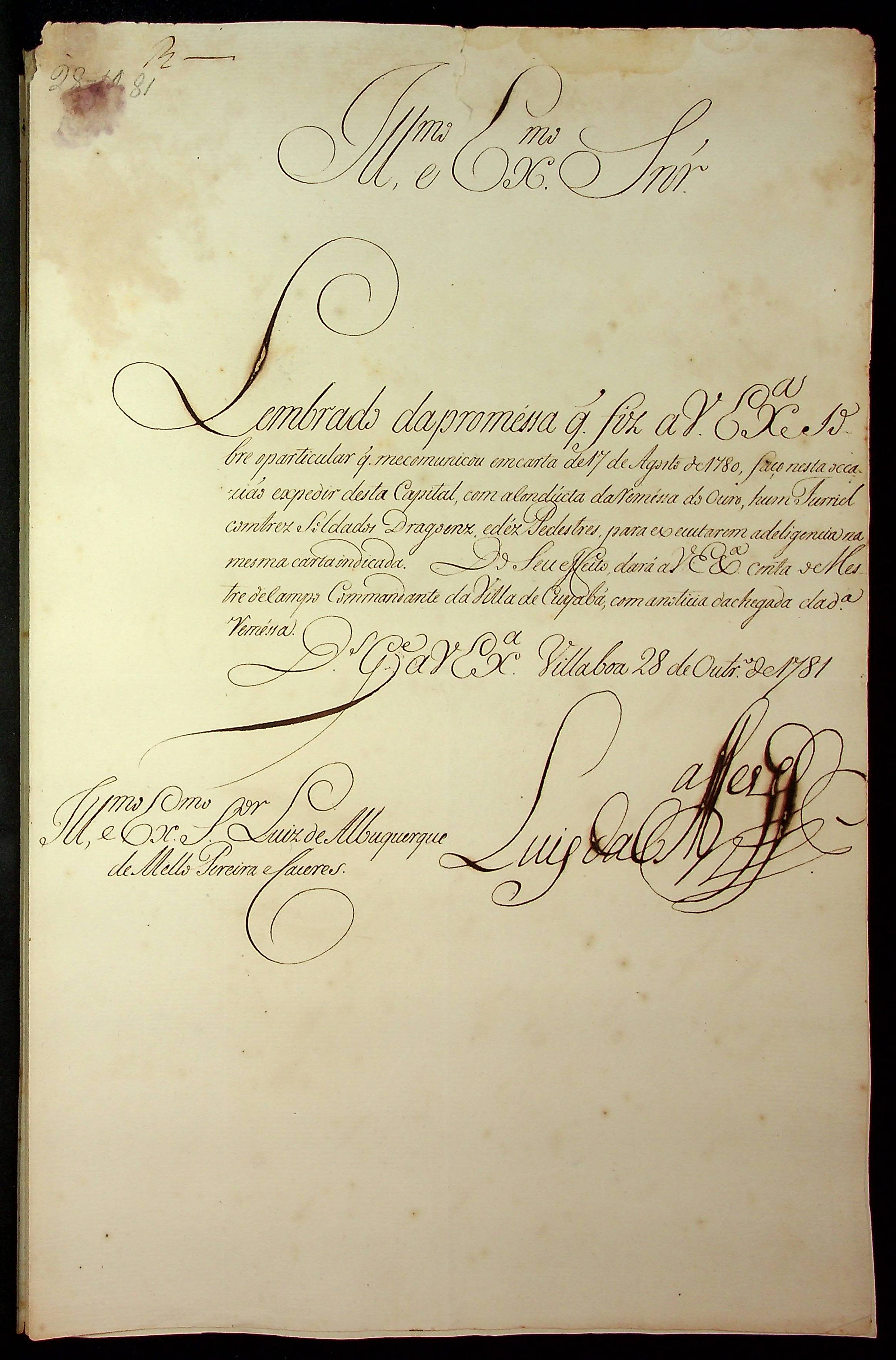 CARTA do [Governador e Capitão-General da Capitania de Goiás] Luiz da Cunha Menezes ao [Governador e Capitão-General da Capitania de Mato Grosso] Luiz de Albuquerque de Melo Pereira e Cáceres.