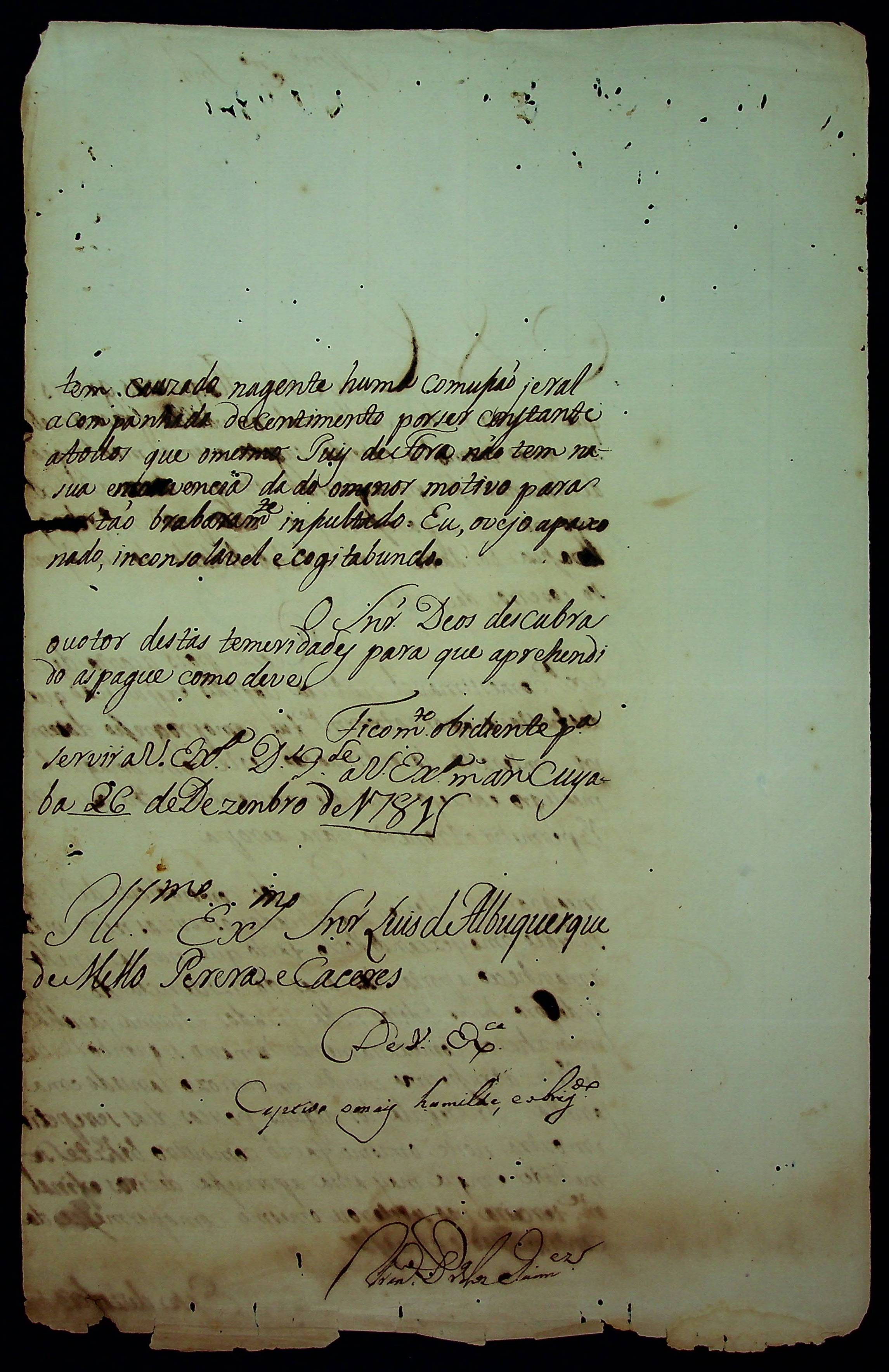 CARTA de [Francisco Pereira dos Guimarães] ao [Governador e Capitão-General da Capitania de Mato Grosso] Luiz de Albuquerque de Melo Pereira e Cáceres.