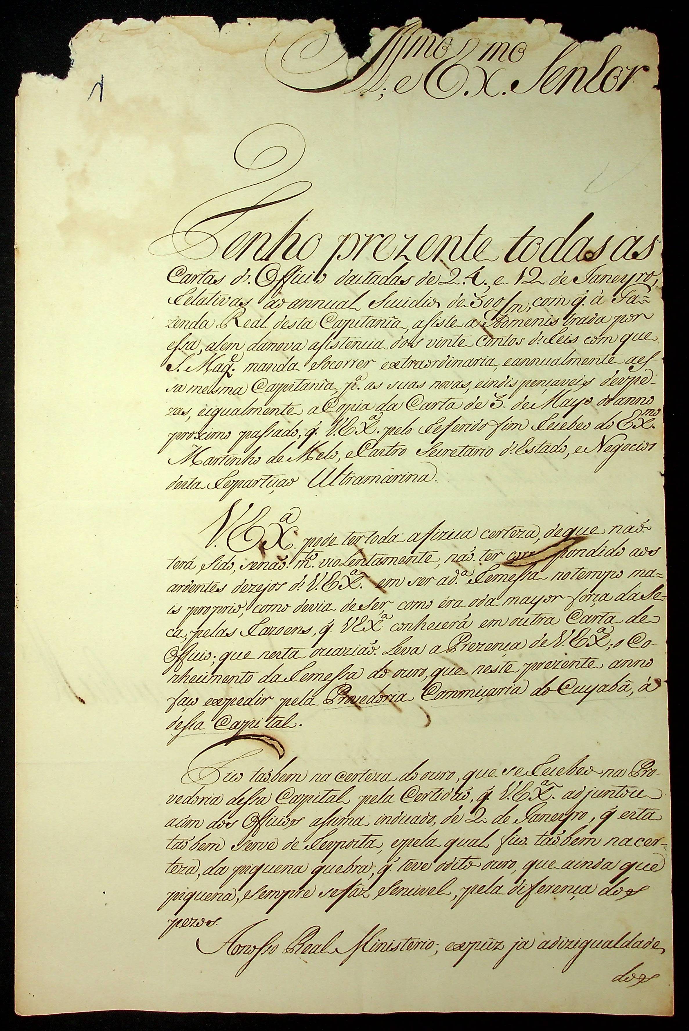 CARTA do [Governador e Capitão General da Capitania de Goiás] Luiz da Cunha Menezes ao [Governador e Capitão-General da Capitania de Mato Grosso] Luiz de Albuquerque de Melo Pereira e Cáceres.