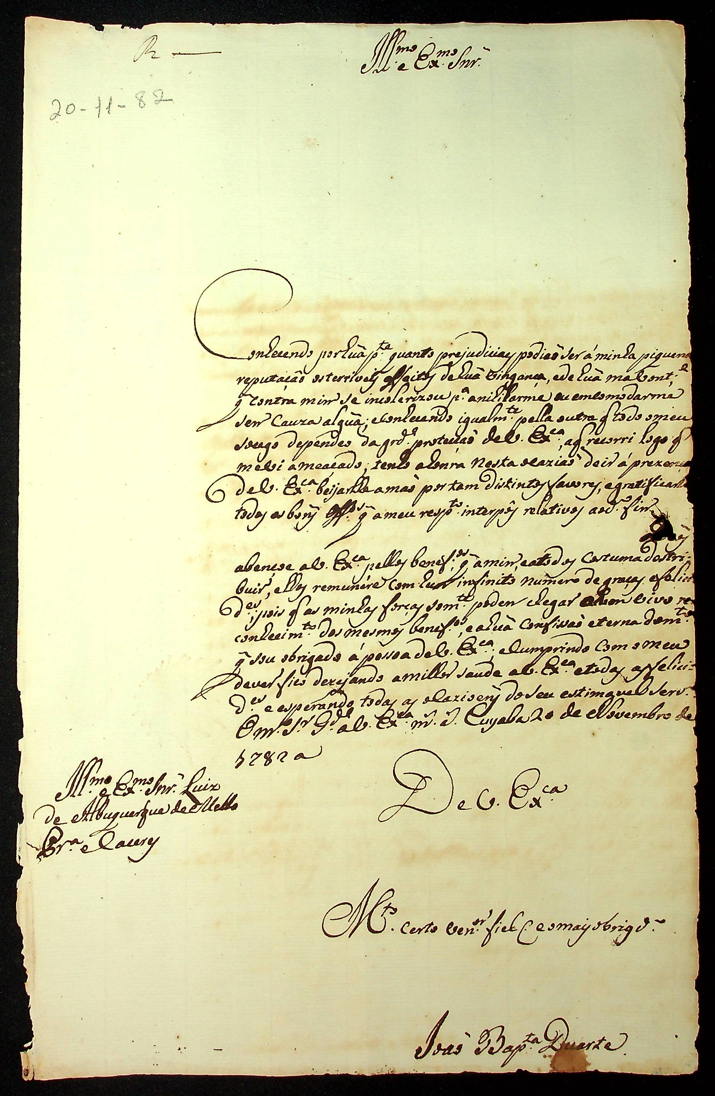 CARTA de João Batista Duarte ao [Governador e Capitão-General da Capitania de Mato Grosso] Luiz de Albuquerque de Melo Pereira e Cáceres.
