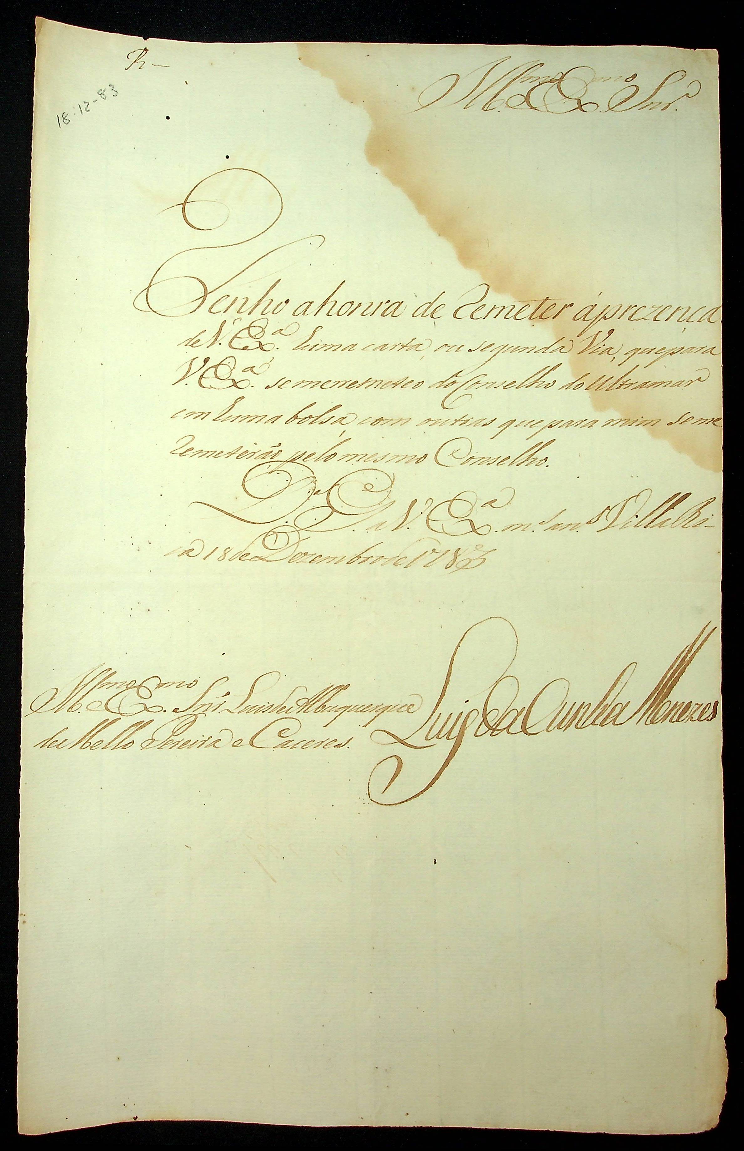 CARTA do [Governador e Capitão-General da Capitania de Minas Gerais] Luiz da Cunha Meneses ao [Governador e Capitão-General da Capitania de Mato Grosso] Luiz de Albuquerque de Melo Pereira e Cáceres.