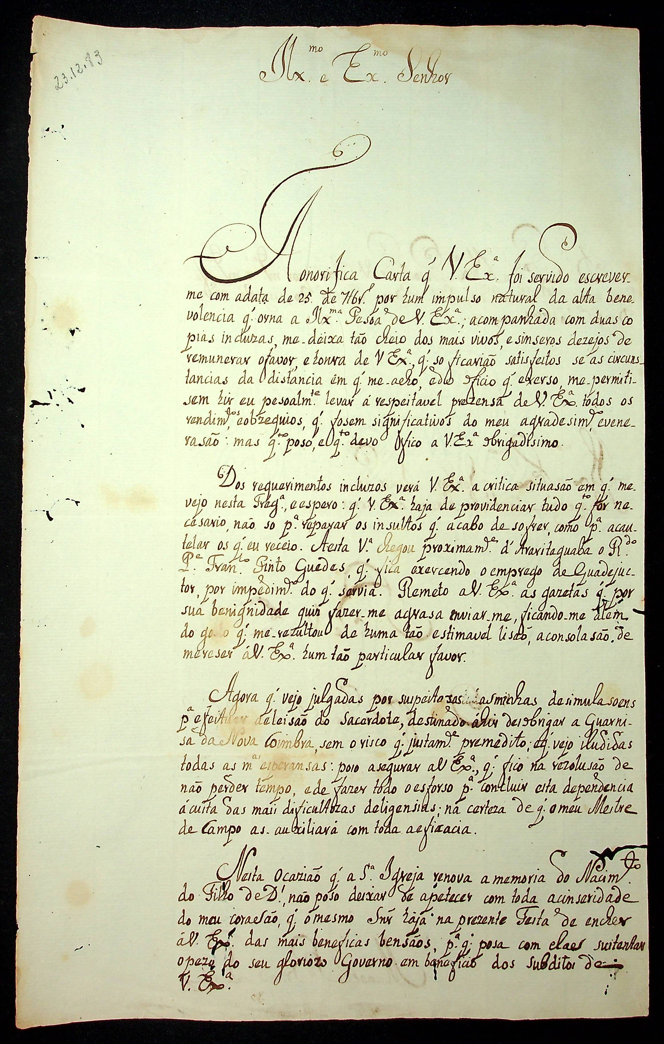 CARTA de Manoel Bruno Lima ao [Governador e Capitão-General da Capitania de Mato Grosso] Luiz de Albuquerque de Melo Pereira e Cáceres.