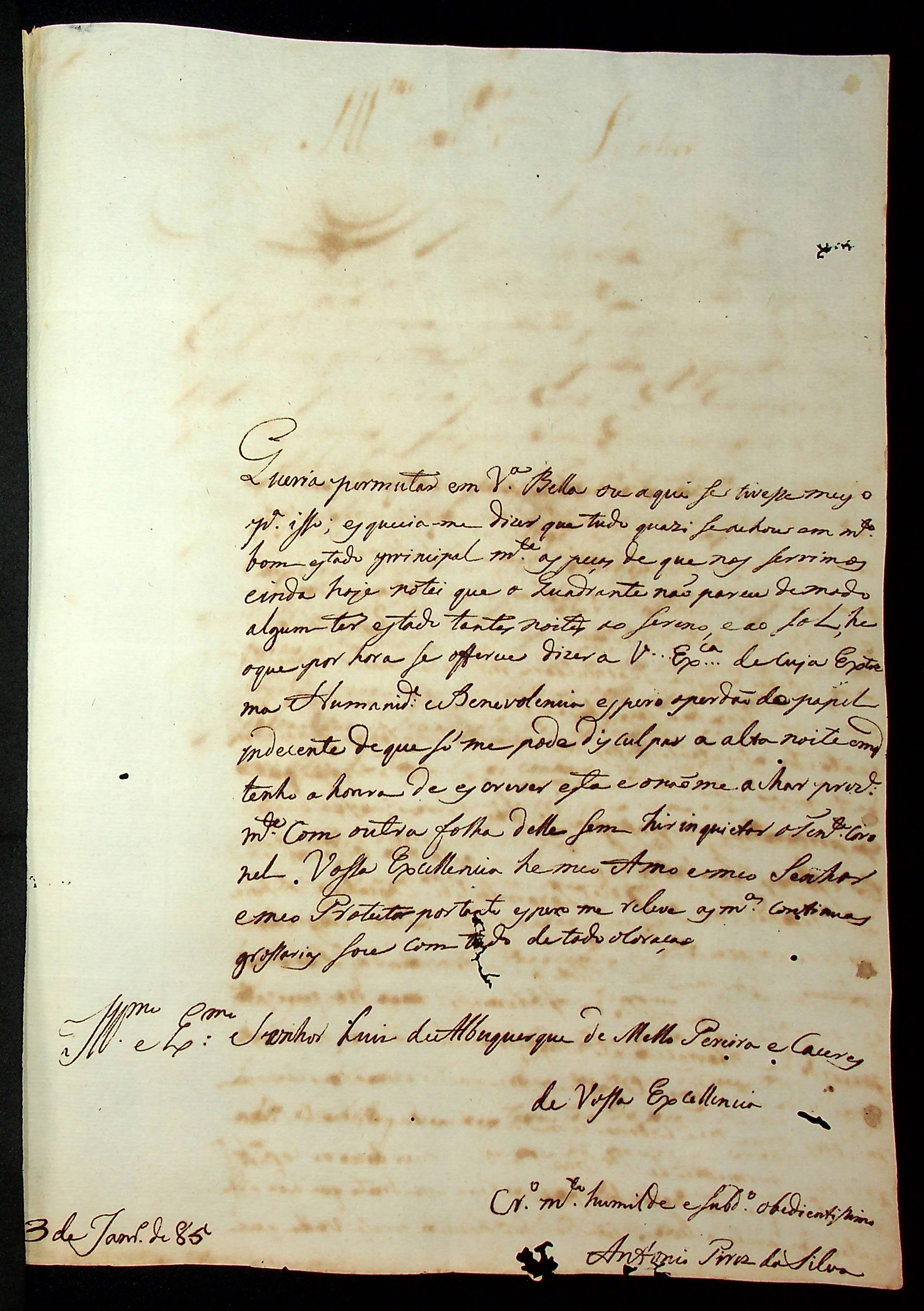 CARTA do [Doutor e Astrônomo] Antônio Pires da Silva ao [Governador e Capitão-General da Capitania de Mato Grosso] Luiz de Albuquerque de Melo Pereira e Cáceres.