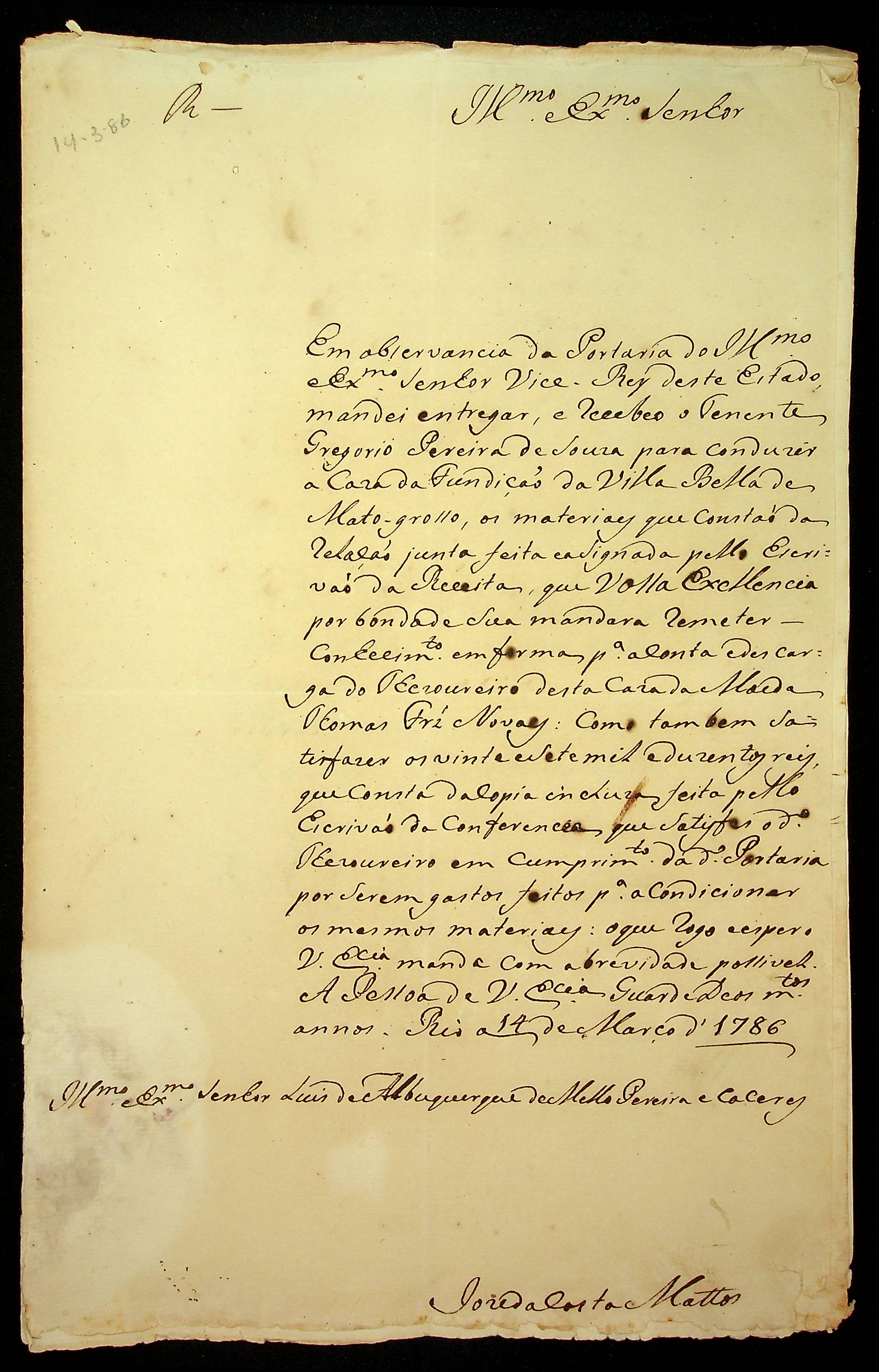 CARTA de José da Costa Matos ao [Governador e Capitão General da Capitania de Mato Grosso] Luiz de Albuquerque de Mello Pereira e Cáceres.