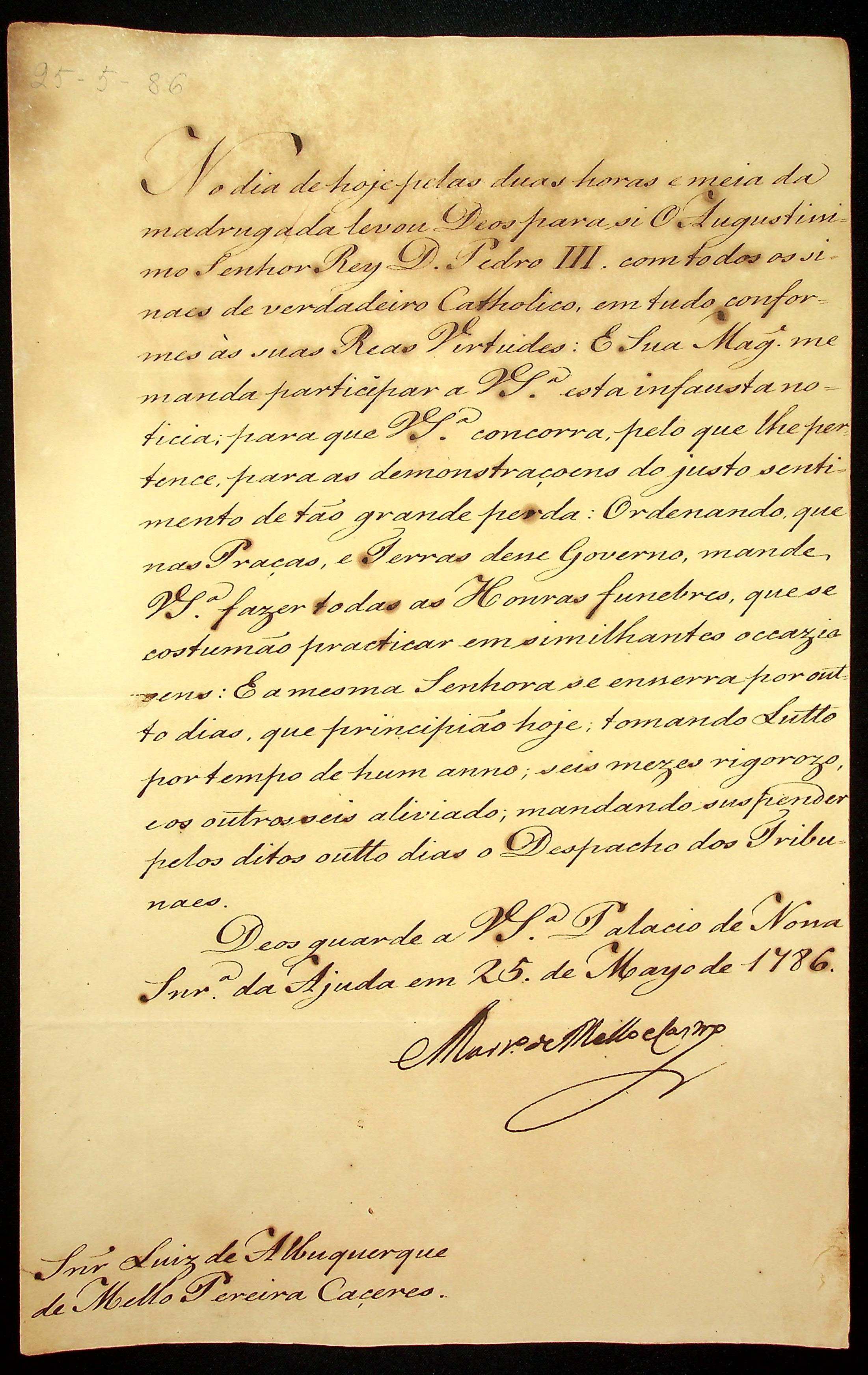 CARTA do [Secretário do Palácio de Nossa Senhora da Ajuda] Martinho de Melo e Castro ao [Governador e Capitão-General da Capitania de Mato Grosso] Luiz de Albuquerque de Melo Pereira e Cáceres.