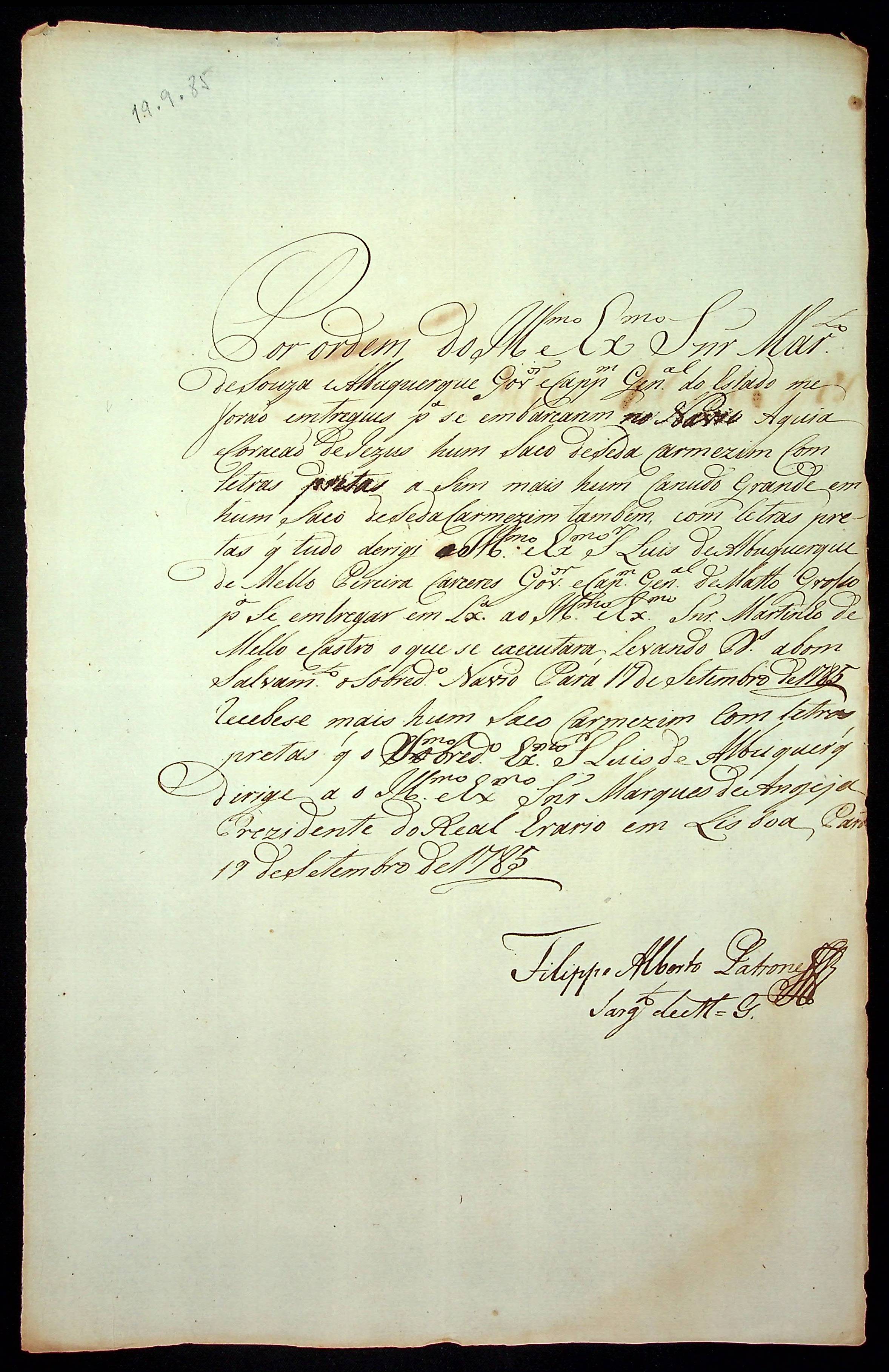 CARTA de Martinho de Souza Albuquerque ao [Governador e Capitão-General da Capitania de Mato Grosso] Luiz de Albuquerque de Melo Pereira e Cáceres.