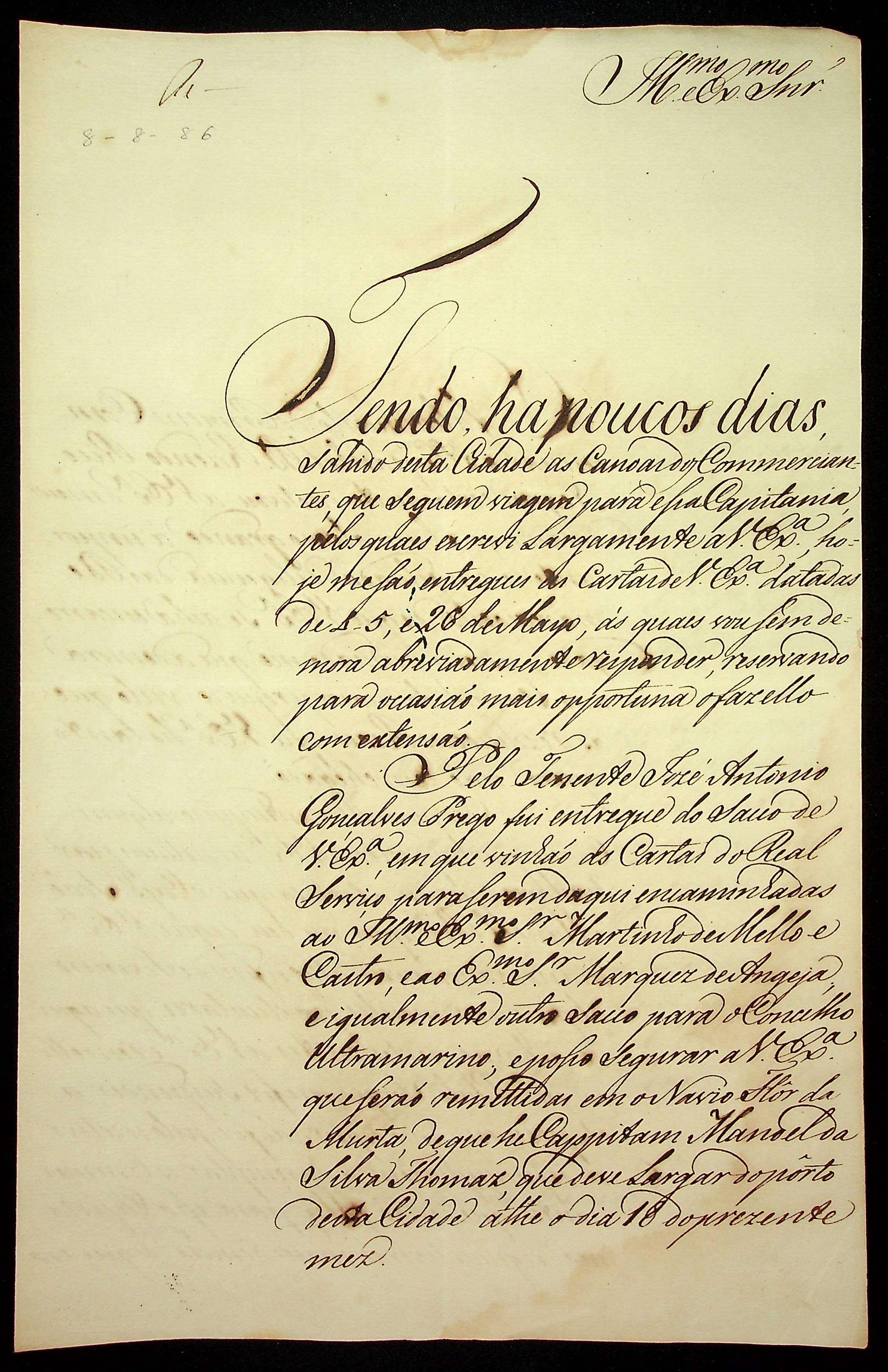 CARTA de Martinho de Souza Albuquerque ao [Governador e Capitão-General da Capitania de Mato Grosso] Luiz de Albuquerque de Melo Pereira e Cáceres.