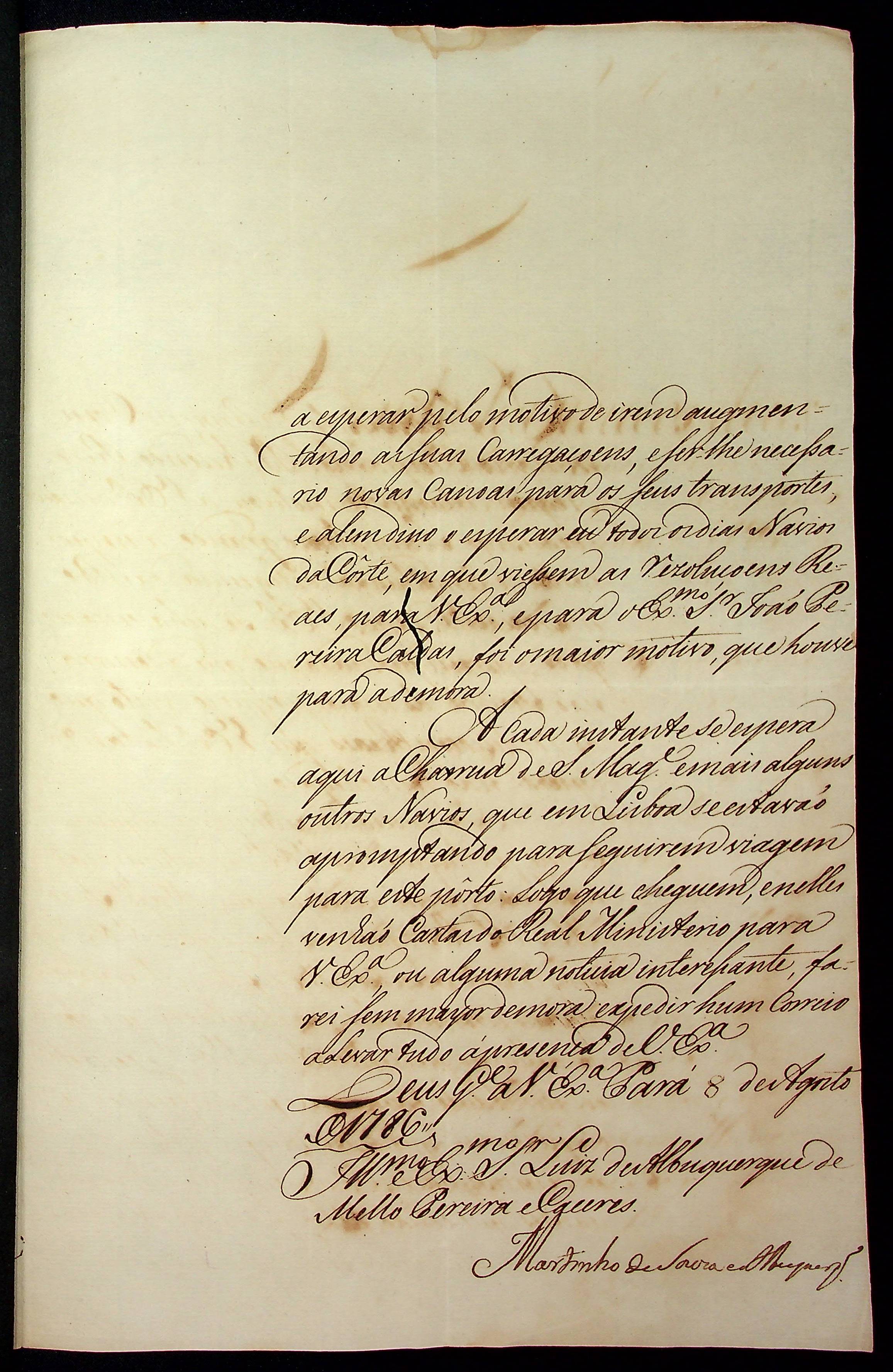CARTA de Martinho de Souza Albuquerque ao [Governador e Capitão-General da Capitania de Mato Grosso] Luiz de Albuquerque de Melo Pereira e Cáceres.