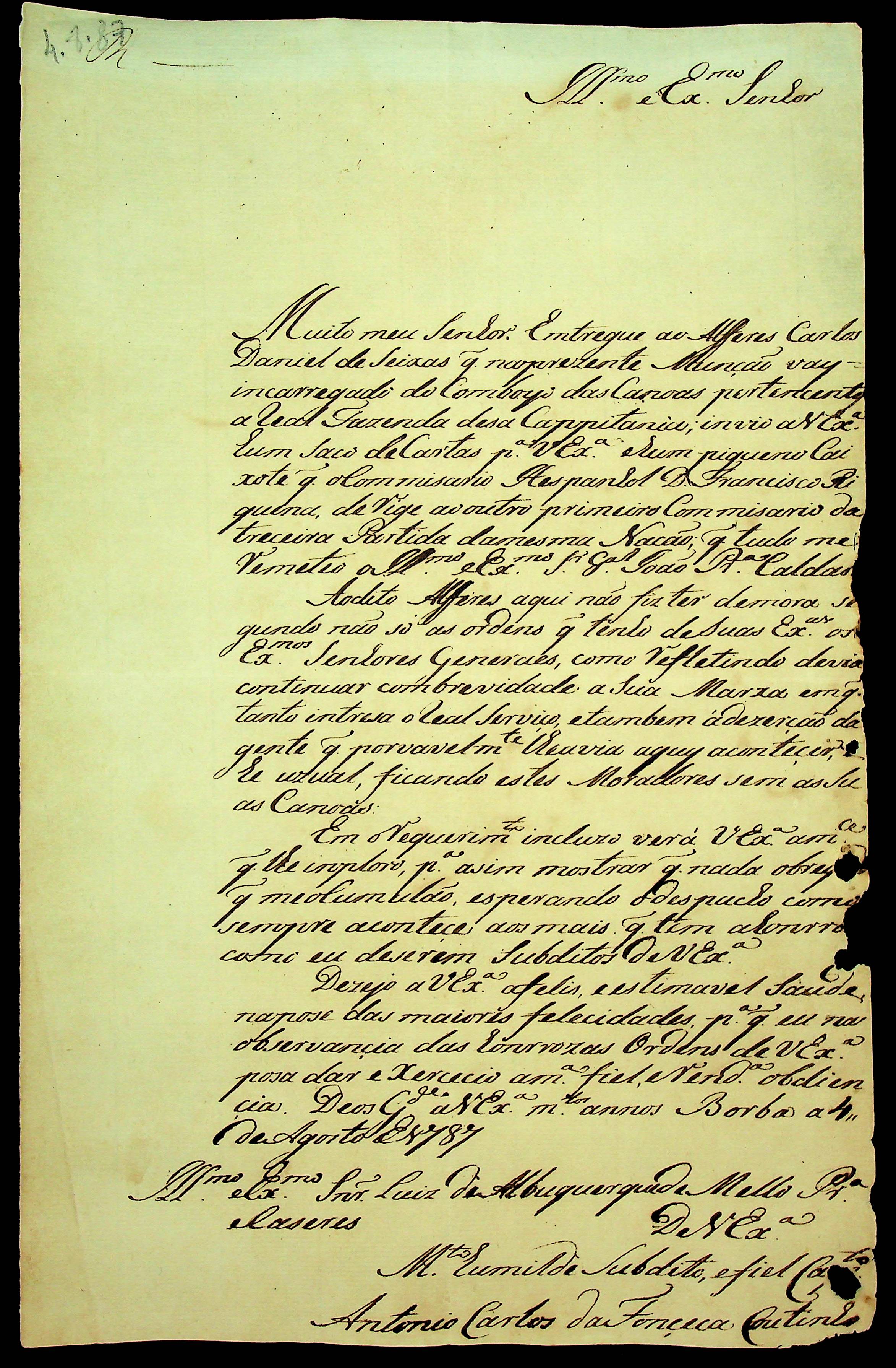 CARTA de Antônio Carlos da Fonseca Coutinho ao [Governador e Capitão-General da Capitania de Mato Grosso] Luiz de Albuquerque de Melo Pereira e Cáceres.