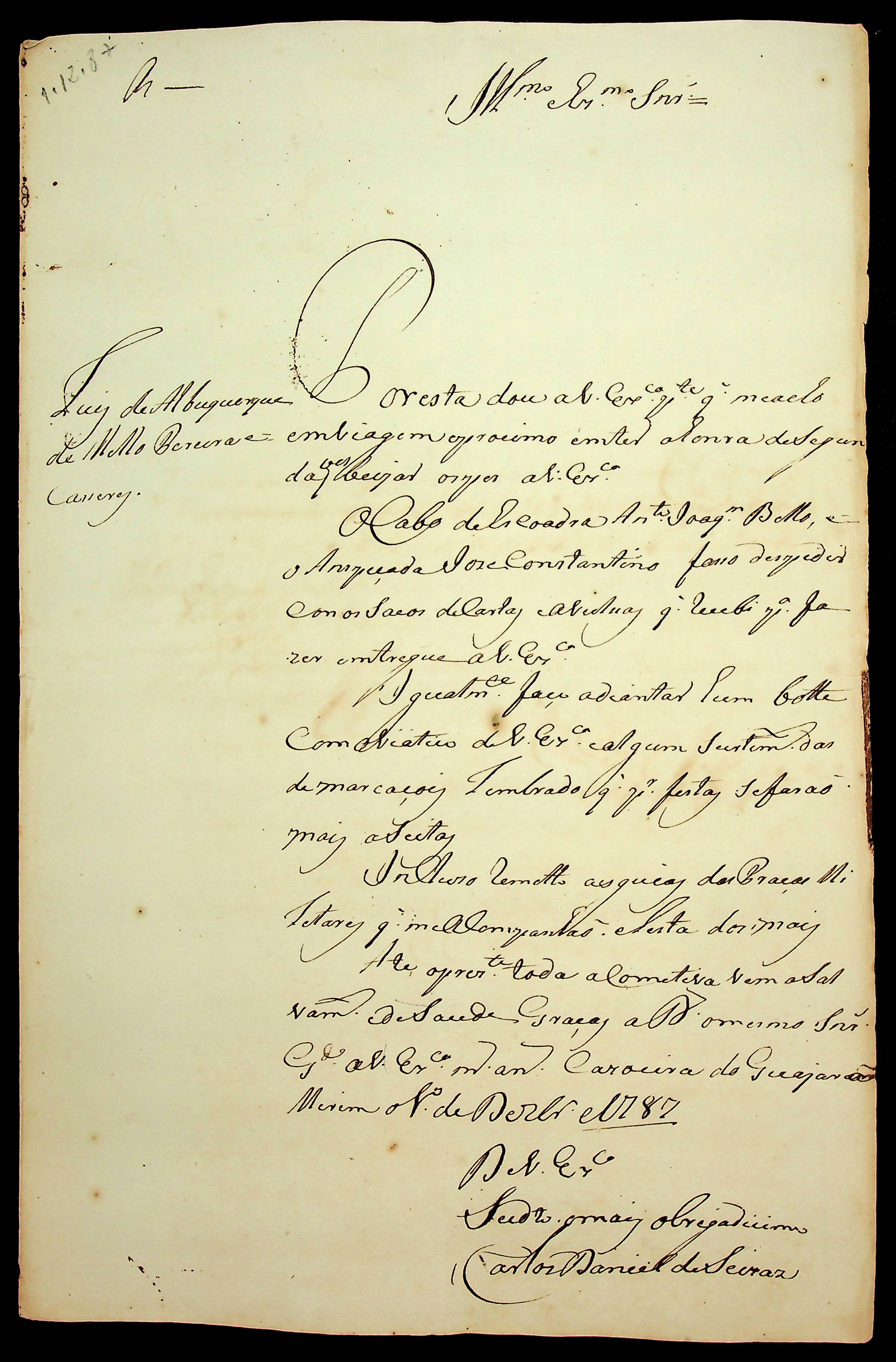 CARTA de Carlos Daniel Seixas ao [Governador e Capitão-General da Capitania de Mato Grosso] Luiz de Albuquerque de Melo Pereira e Cáceres.