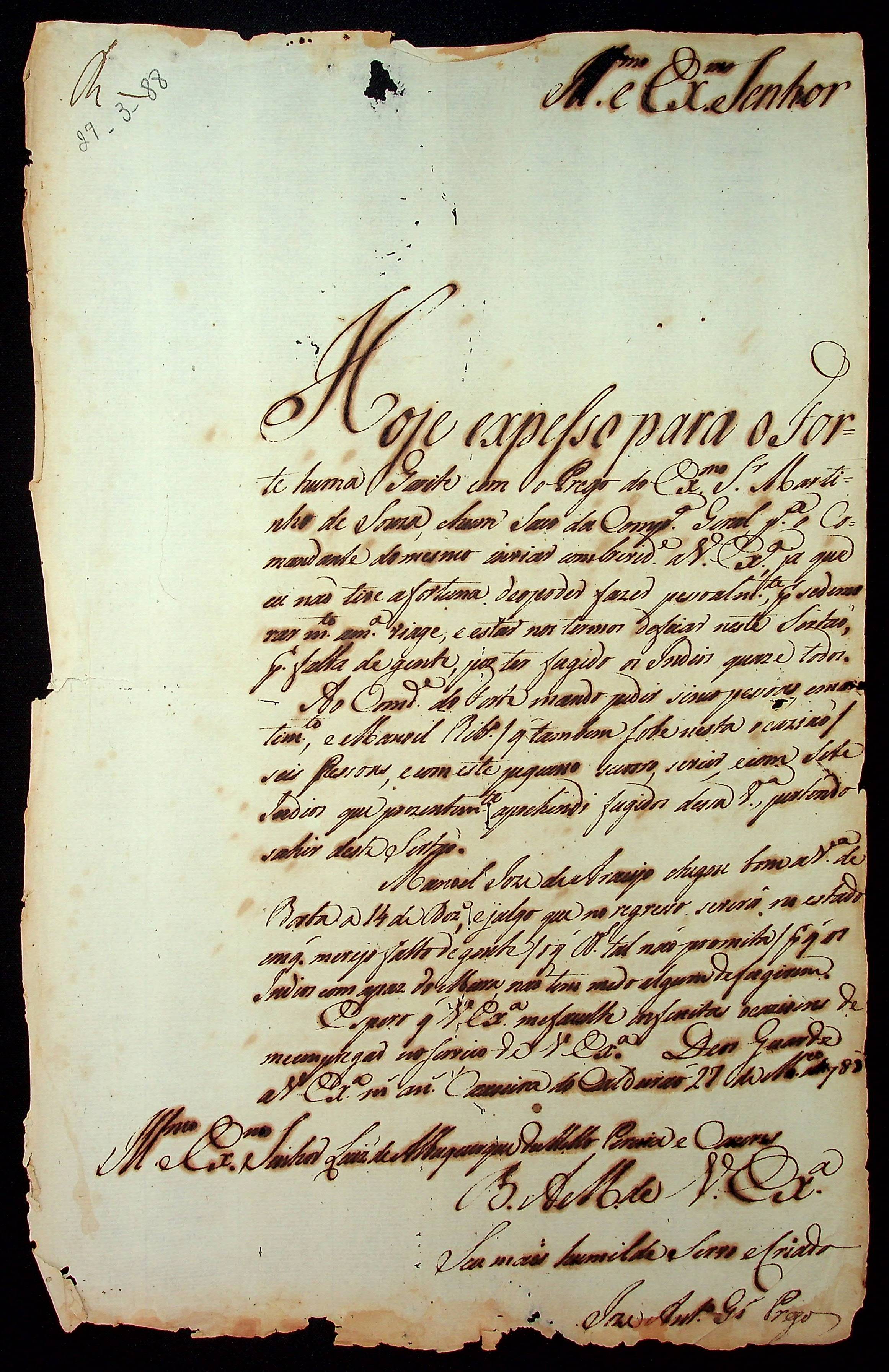 CARTA de José Antônio de Souza Gonçalves Prego ao [Governador e Capitão-General da Capitania de Mato Grosso] Luiz de Albuquerque de Melo Pereira e Cáceres.