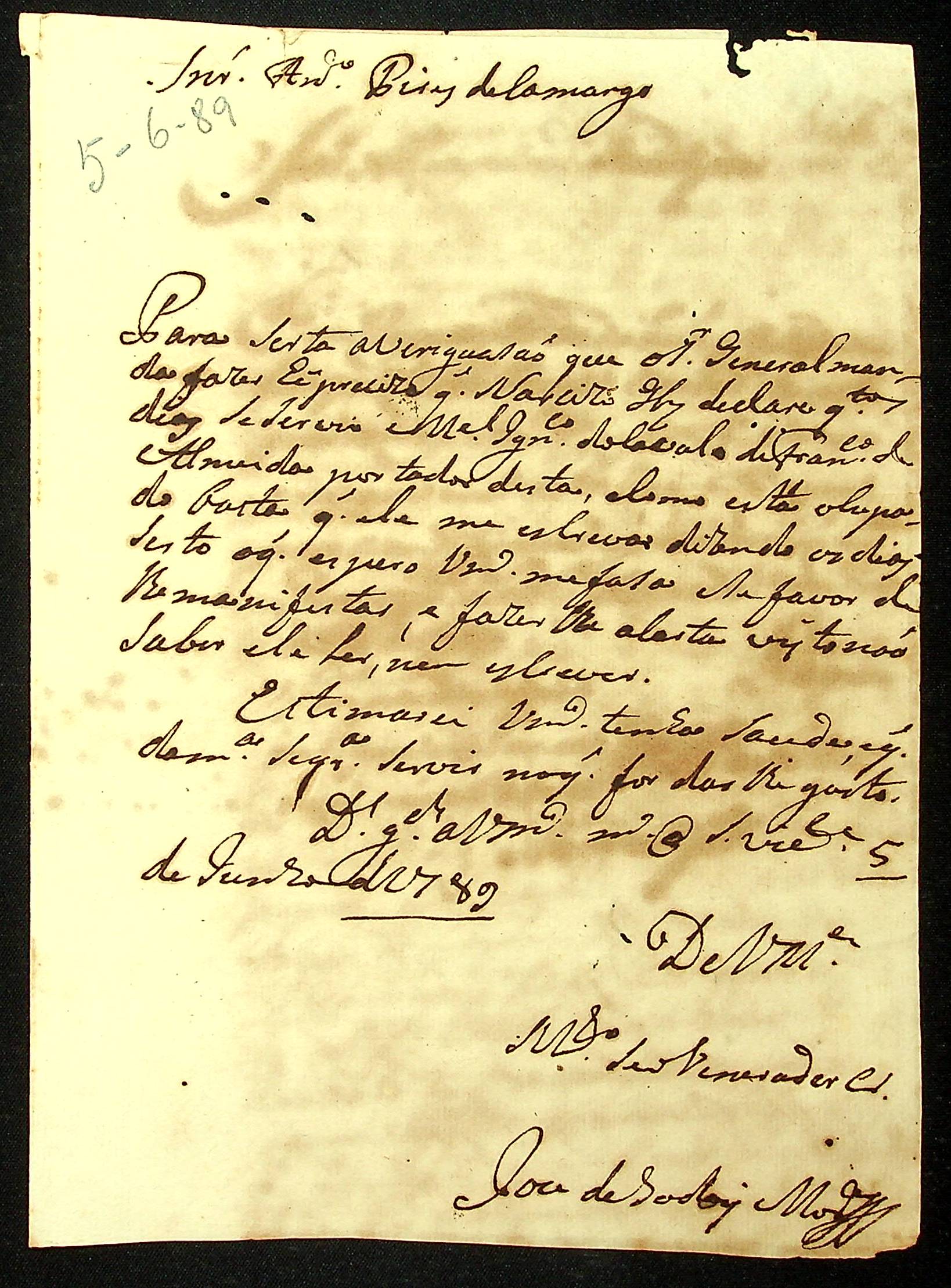 CARTA do [Alferes] José de Godói Moreira ao [Governador e Capitão-General da Capitania de Mato Grosso] Luiz de Albuquerque de Melo Pereira e Cáceres.