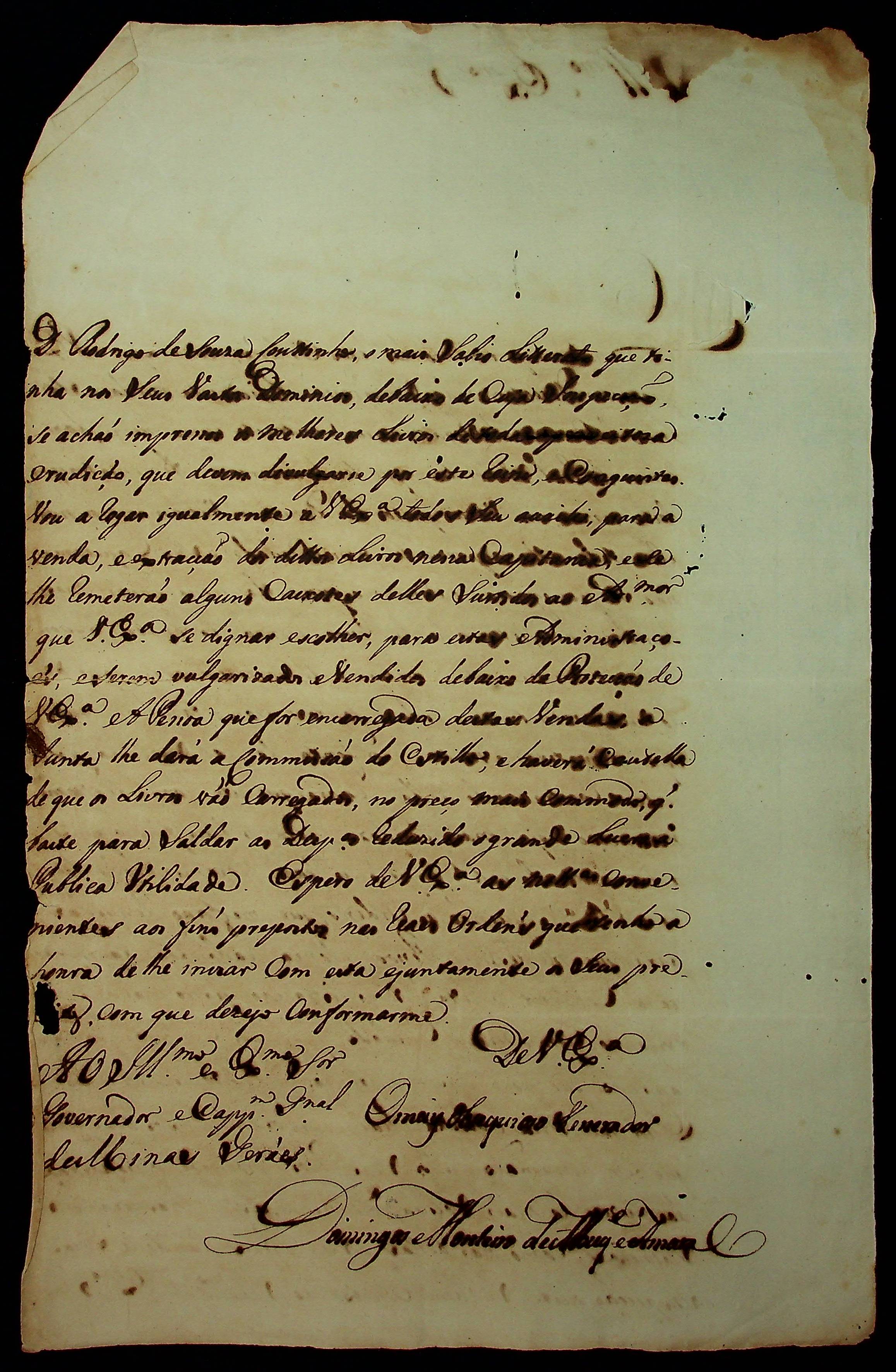 CARTA de Domingos Monteiro de Albuquerque e Amaral ao Governador e Capitão-General da Capitania de Minas Gerais, [...].