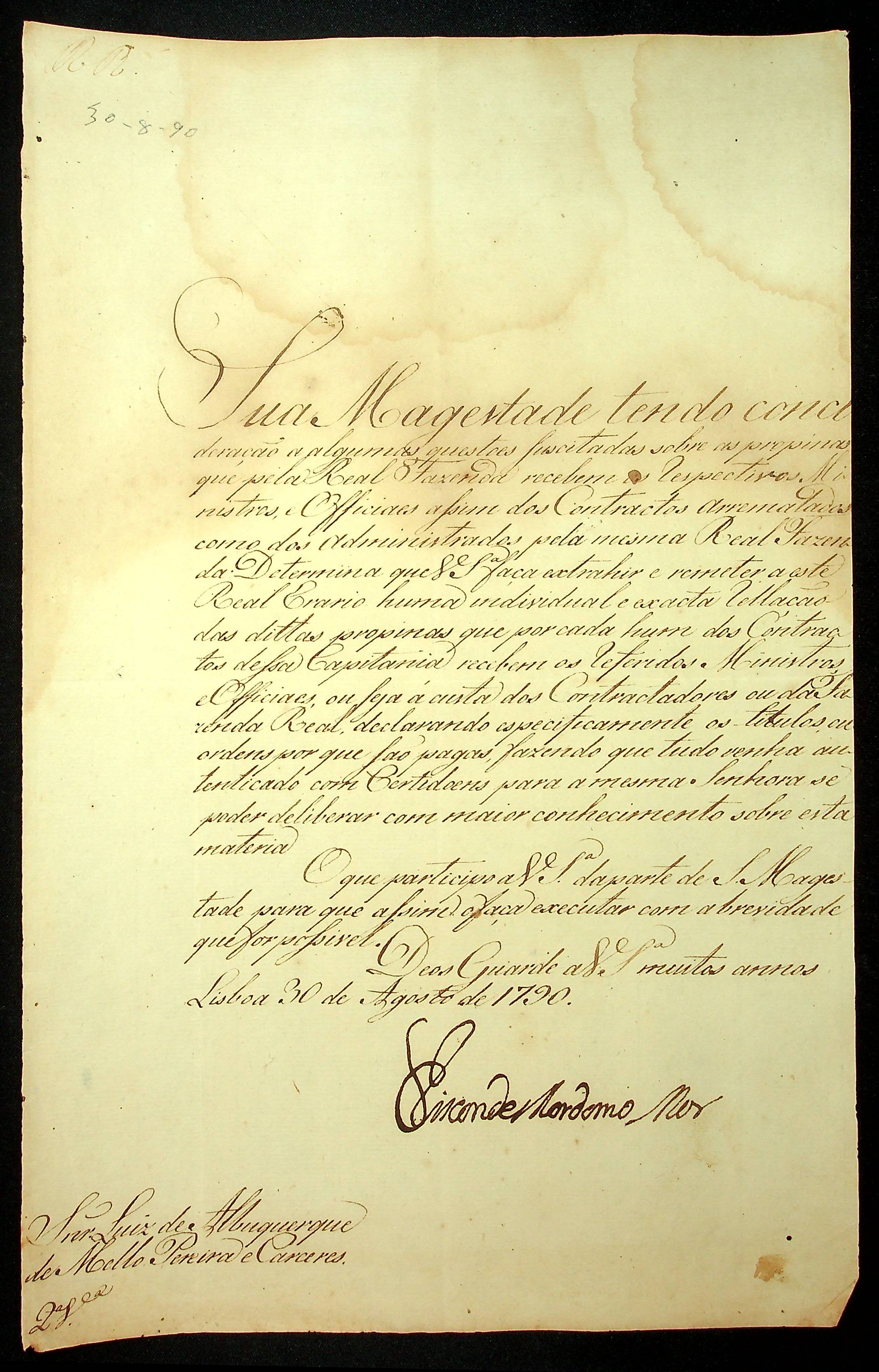 CARTA do Visconde Mordomo-Mor ao [Governador e Capitão-General da Capitania de Mato Grosso] Luiz de Albuquerque de Melo Pereira e Cáceres.
