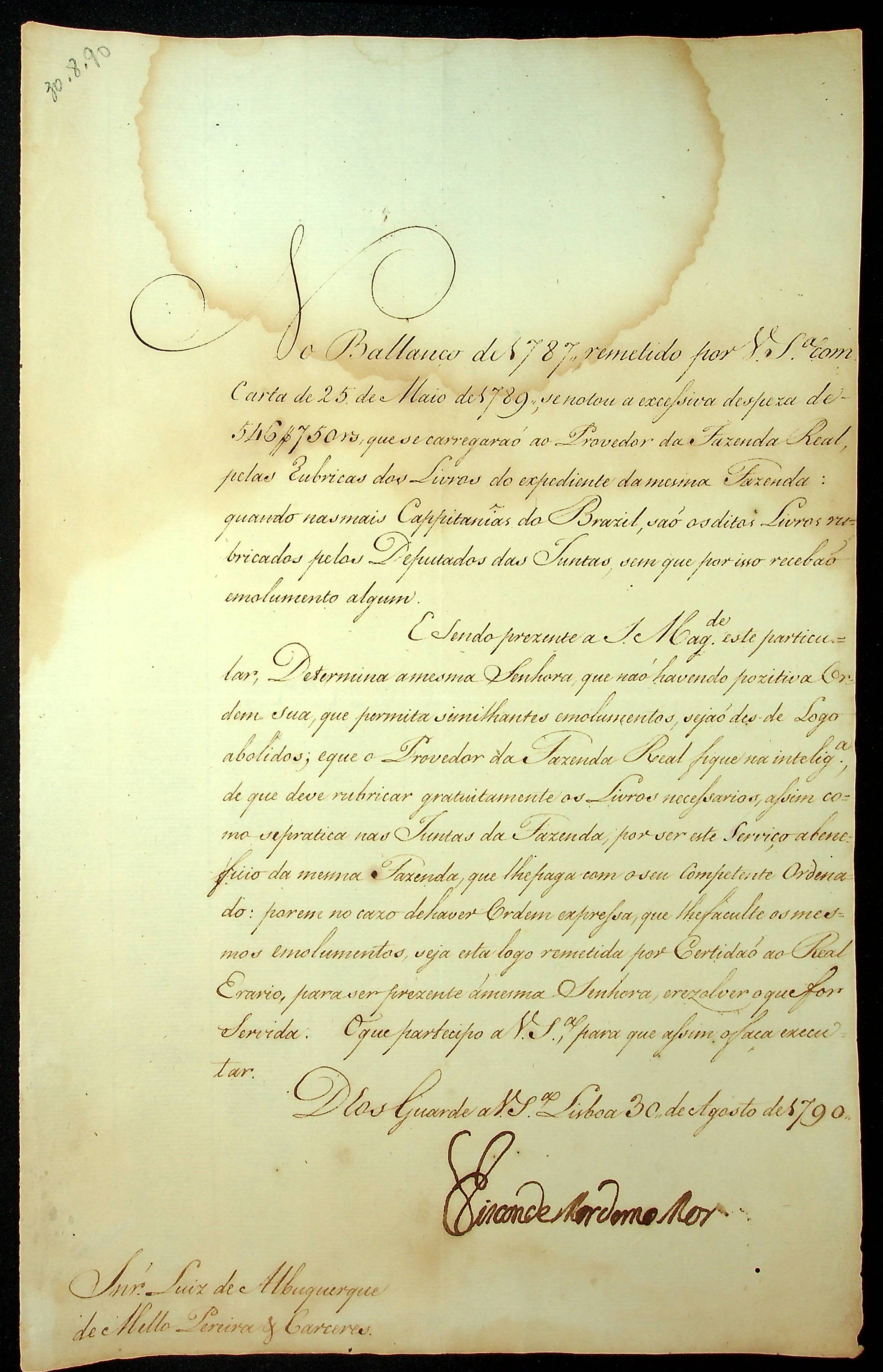 CARTA do Visconde Mordomo-Mor ao [Governador e Capitão-General da Capitania de Mato Grosso] Luiz de Albuquerque de Melo Pereira e Cáceres.