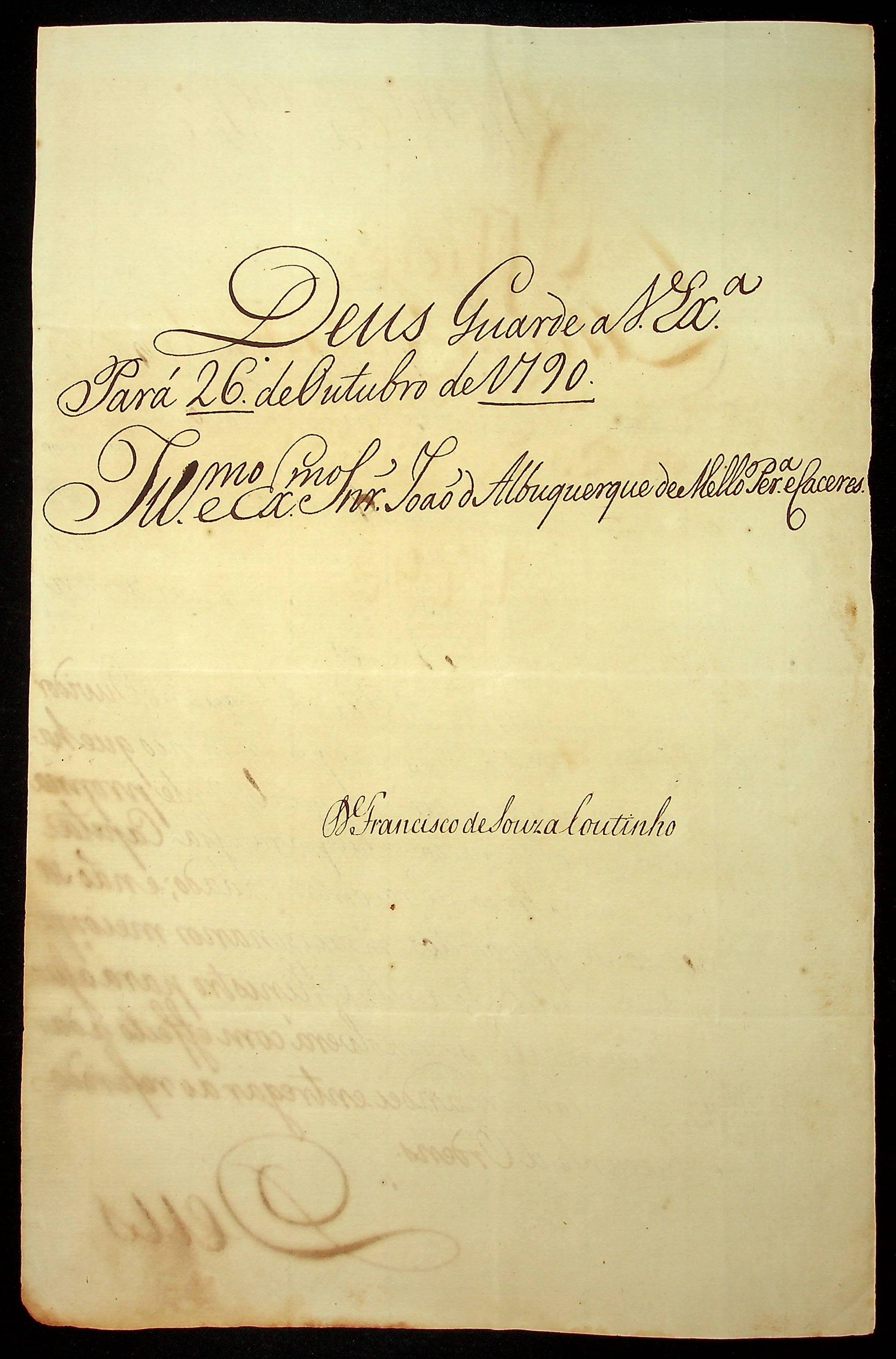CARTA de Francisco de Souza Coutinho ao [Governador e Capitão General da Capitania de Mato Grosso] João de Albuquerque de Melo Pereira e Cáceres.