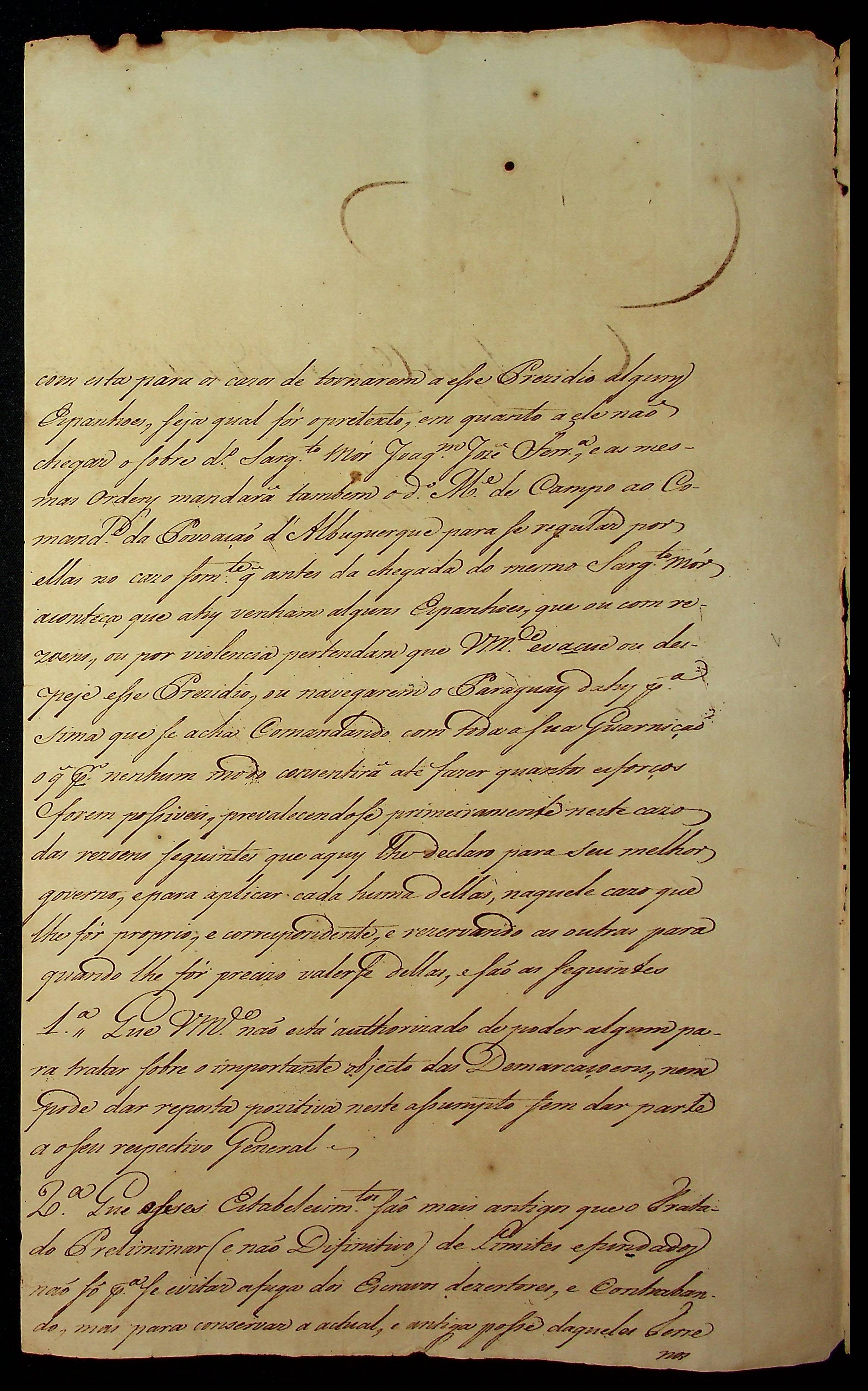 CARTA do [Governador e Capitão General da Capitania de Mato Grosso] João de Albuquerque de Melo Pereira e Cáceres ao Ajudante e Comandante do Presídio de Nova Coimbra Antônio José Pinto de Figueiredo.