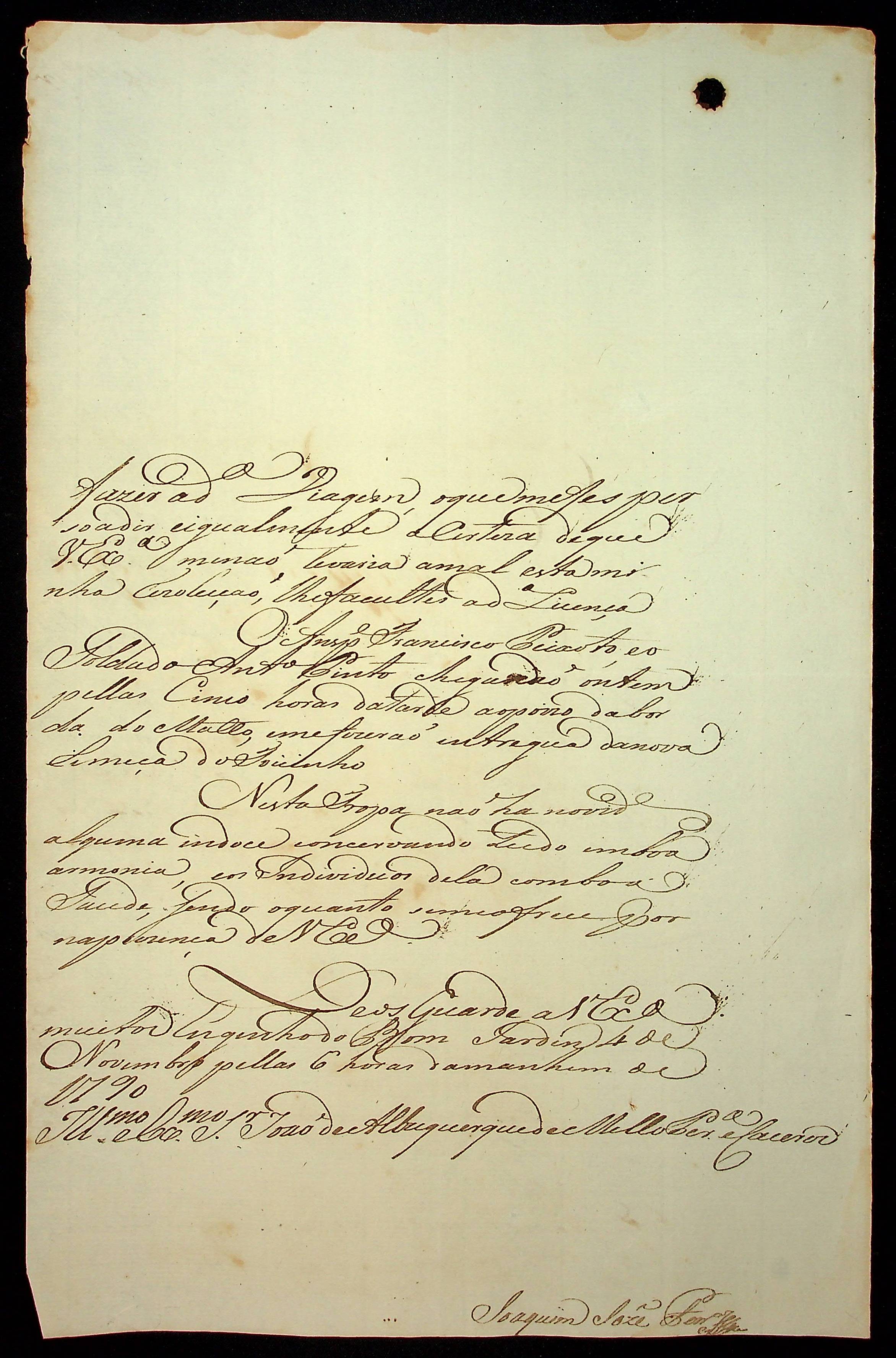 CARTA de Joaquim José [Ferreira] ao [Governador e Capitão General da Capitania de Mato Grosso] João de Albuquerque de Melo Pereira e Cáceres.