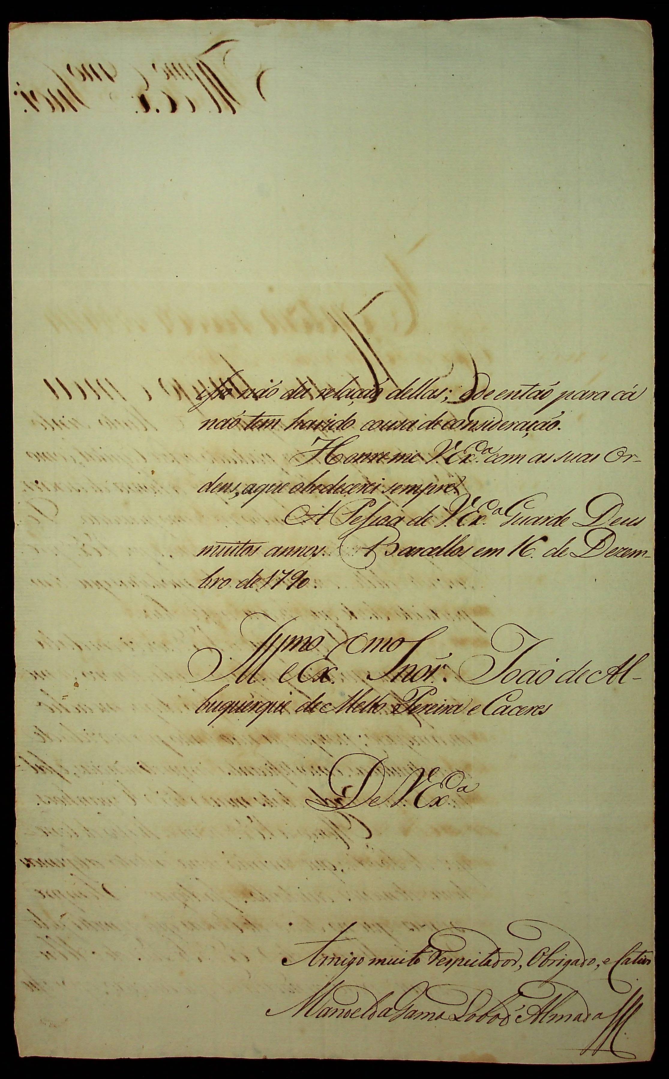 CARTA de Manoel Gama Lobo de Almada ao [Governador e Capitão General da Capitania de Mato Grosso] João de Albuquerque de Melo Pereira e Cáceres.