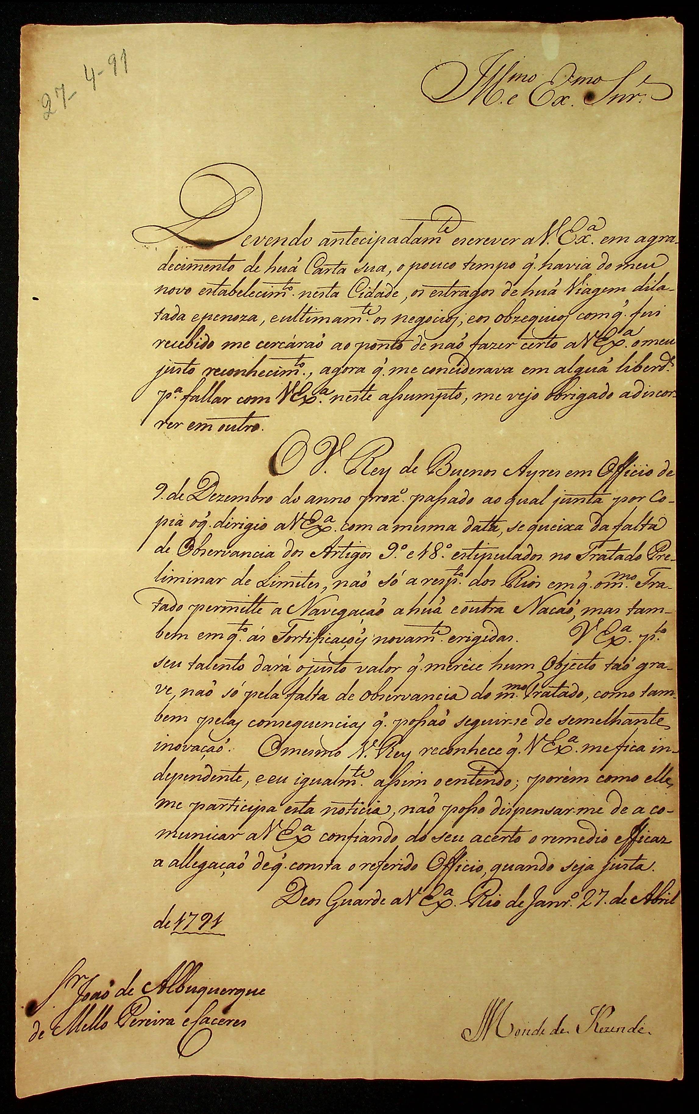 CARTA do Conde de Rezende ao [Governador e Capitão General da Capitania de Mato Grosso] João de Albuquerque de Melo Pereira e Cáceres.