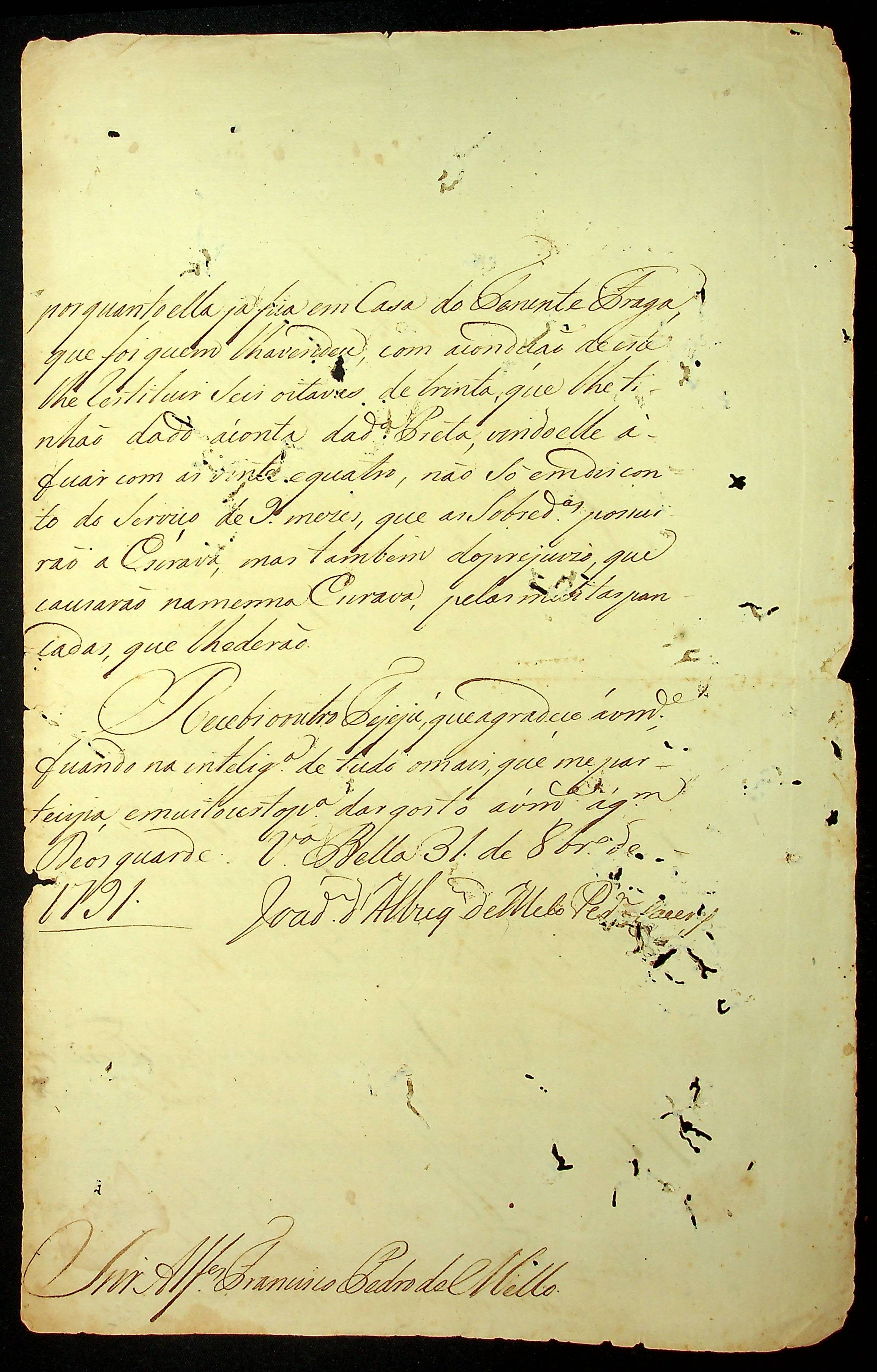 CARTA do [Governador e Capitão General da Capitania de Mato Grosso] João de Albuquerque de Melo Pereira e Cáceres ao Alferes Francisco Pedro de Melo.