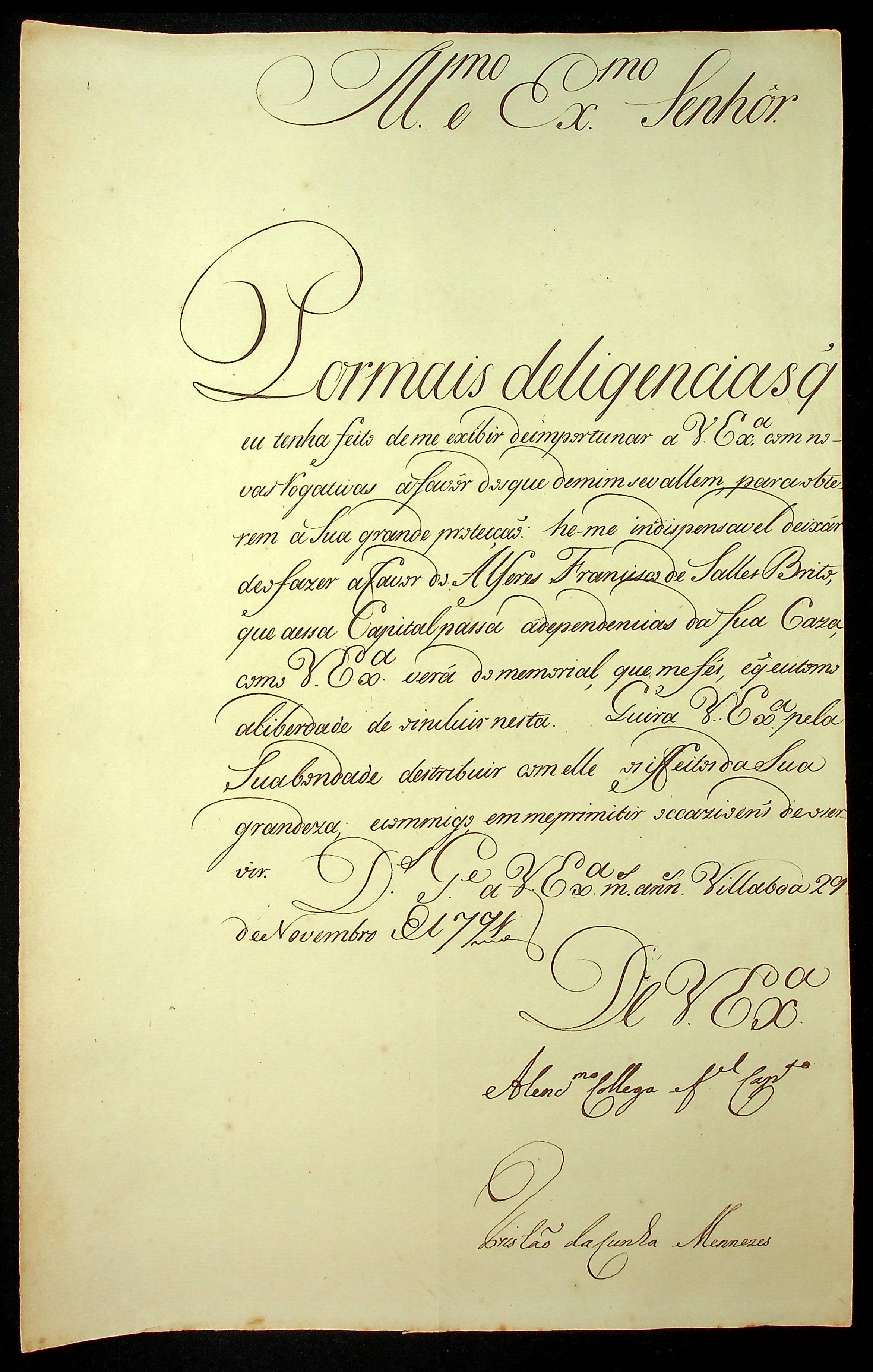 CARTA de Tristão da Cunha Menezes ao [Governador e Capitão General da Capitania de Mato Grosso João de Albuquerque de Melo Pereira e Cáceres].
