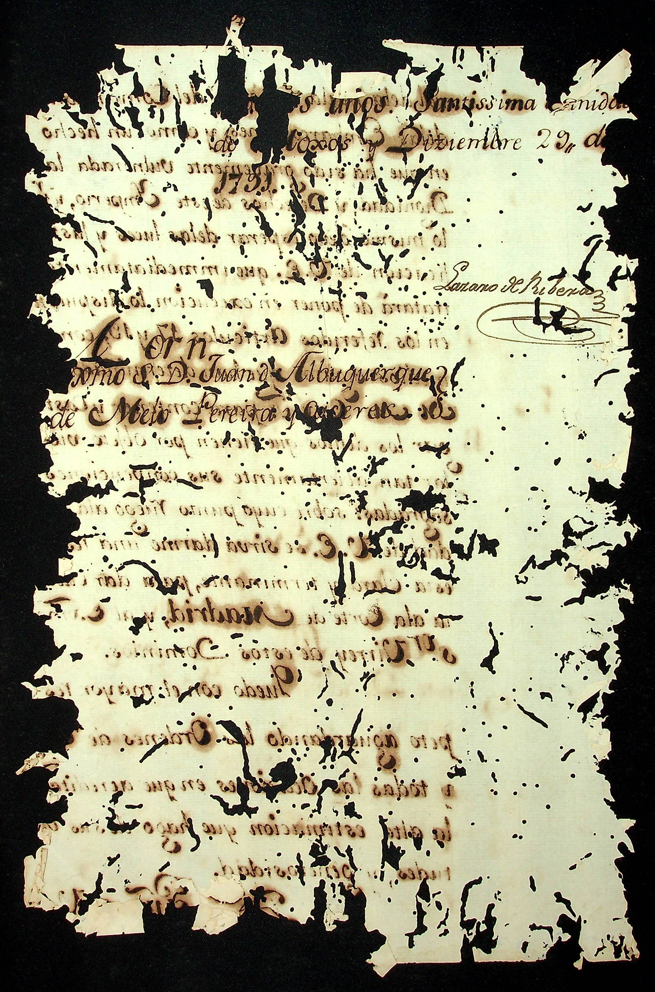 CARTA de Lázaro Ribeira ao [Governador e Capitão General da Capitania de Mato Grosso] João de Albuquerque de Melo Pereira e Cáceres.