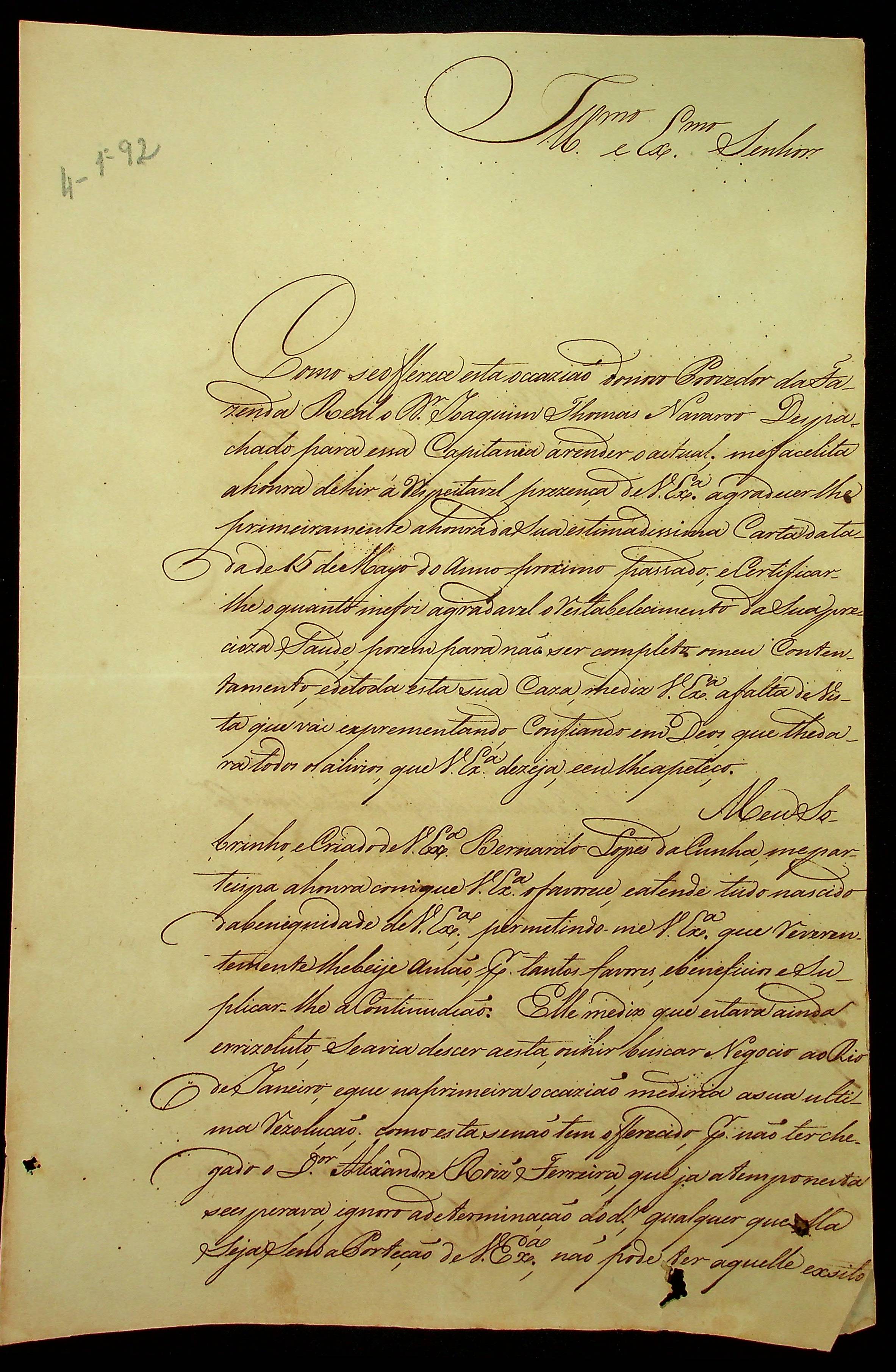 CARTA de Manoel José da Cunha ao [Governador e Capitão-General da Capitania de Mato Grosso] João de Albuquerque de Mello Pereira e Cáceres.