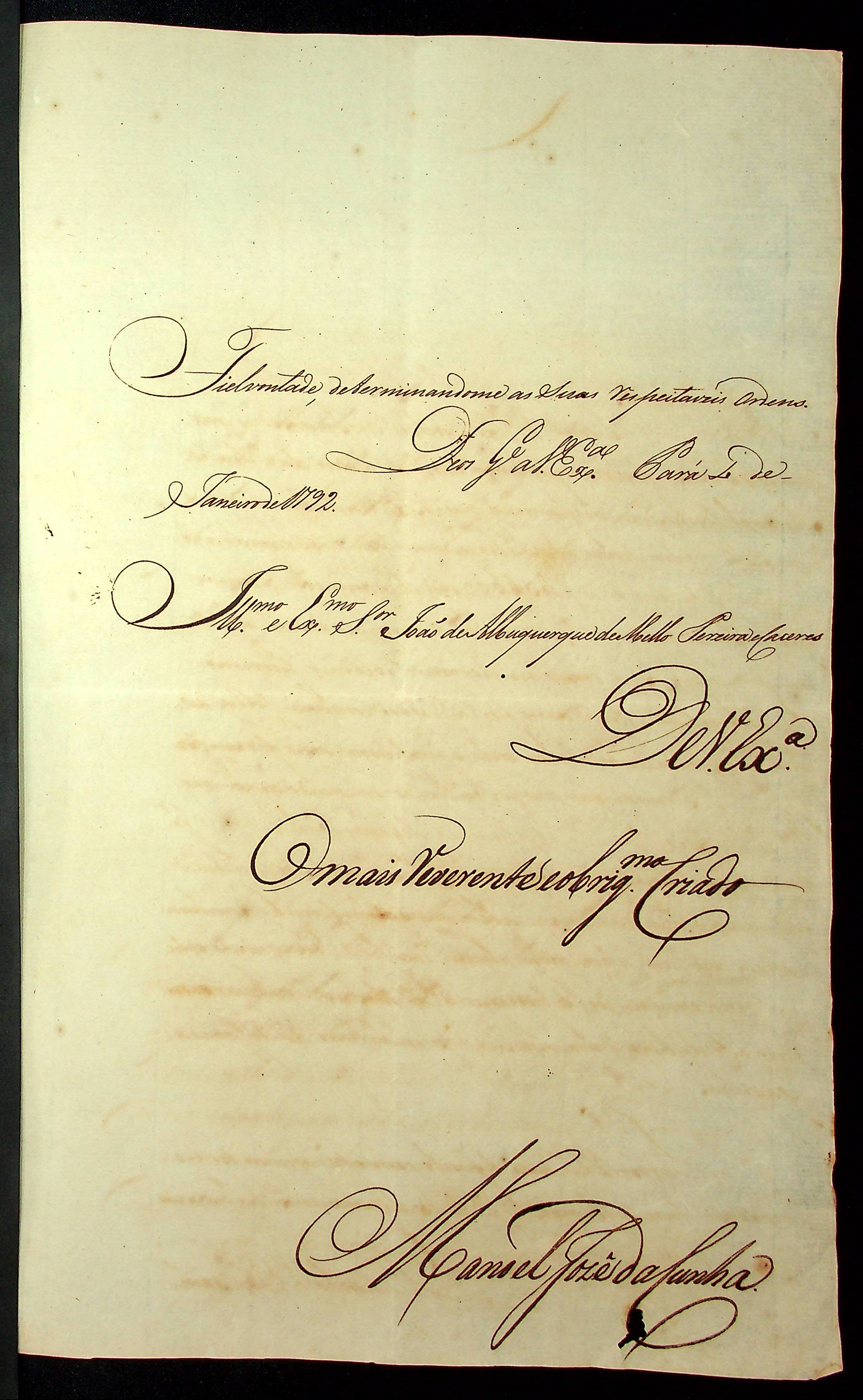CARTA de Manoel José da Cunha ao [Governador e Capitão-General da Capitania de Mato Grosso] João de Albuquerque de Mello Pereira e Cáceres.