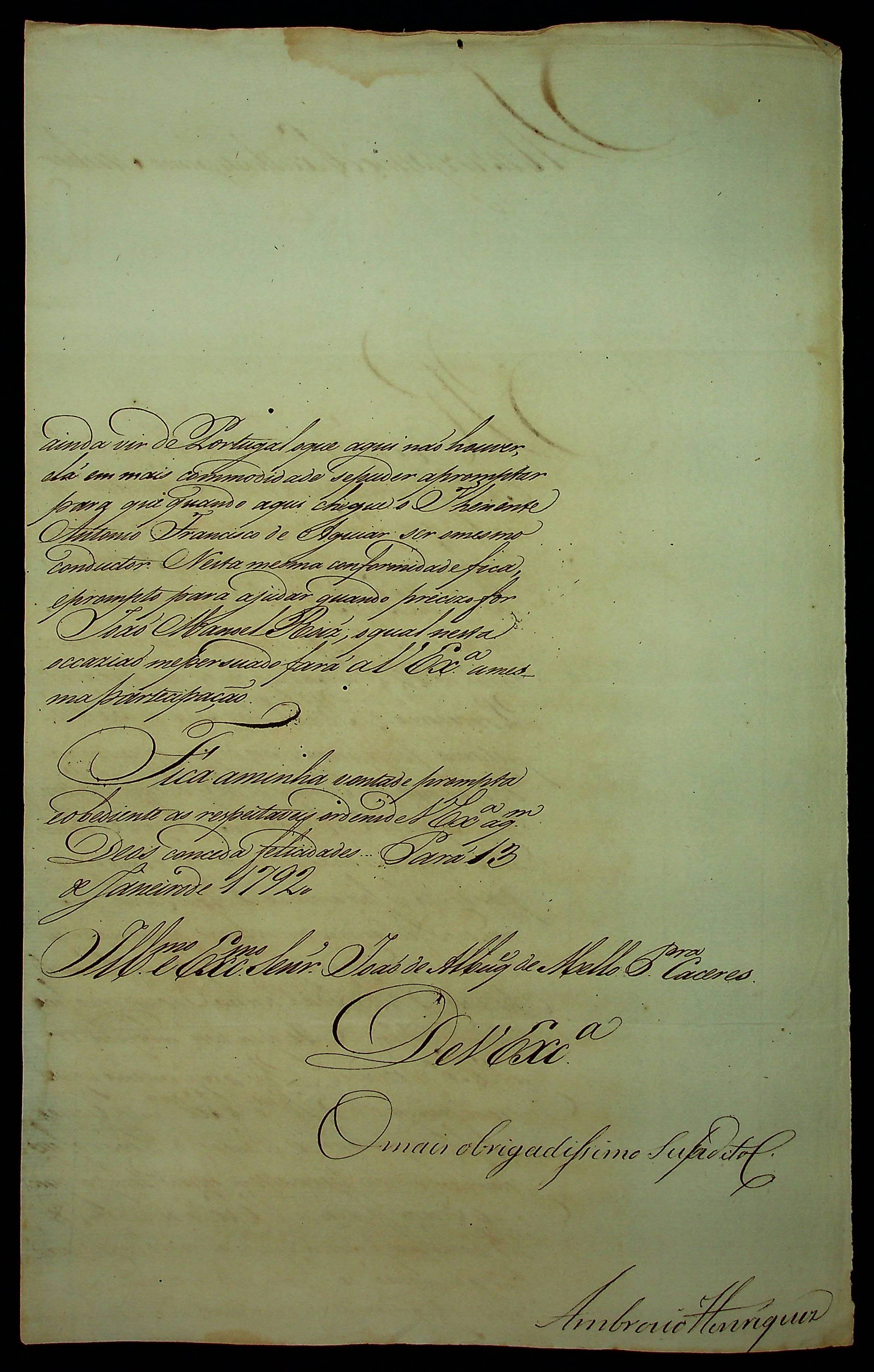CARTA de Ambrósio Henriques ao [Governador e Capitão-General da Capitania de Mato Grosso] João de Albuquerque de Mello Pereira e Cáceres.