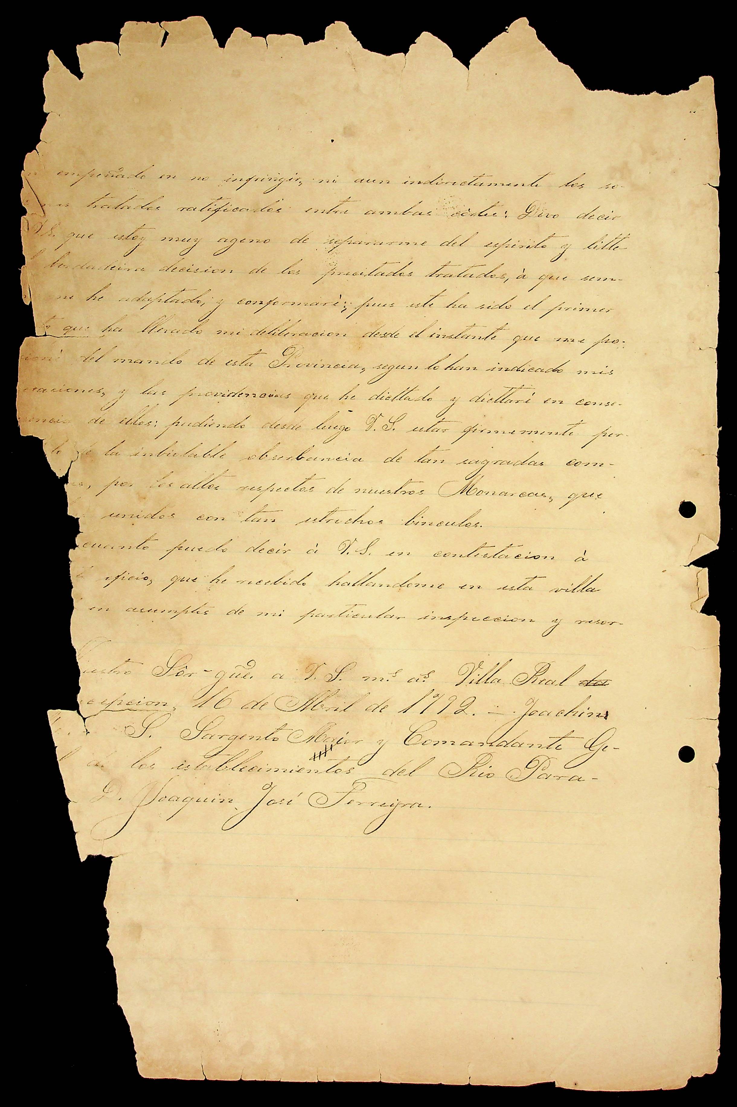 CARTA de Joaquim [Alos] ao Sargento-mor e Comandante-General dos Estabelecimentos do Rio Paraguai Joaquim José Ferreira.