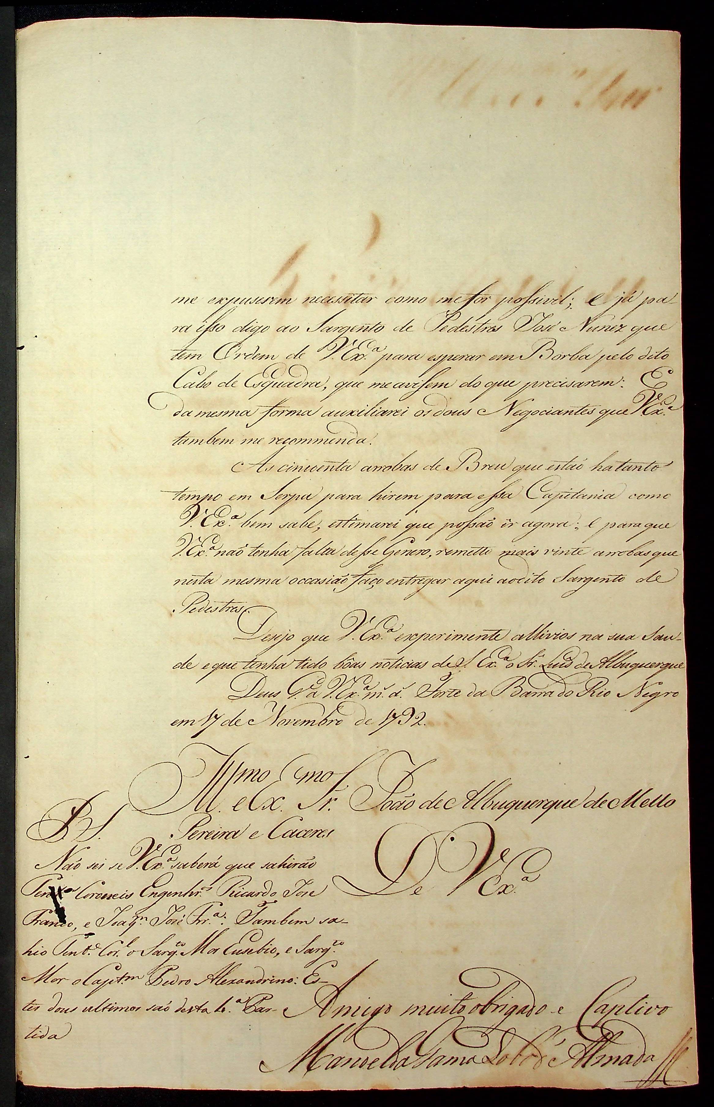 CARTA de Manoel da Gama Lobo d' Almada ao [Governador e Capitão-General da Capitania de Mato Grosso] João de Albuquerque de Mello Pereira e Cáceres.