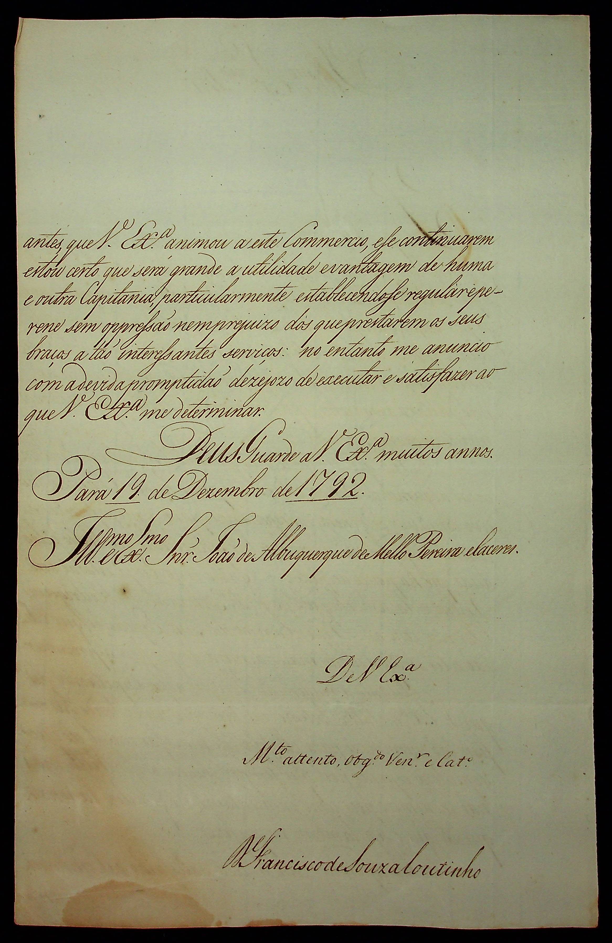 CARTA de Francisco de Souza Coutinho ao [Governador e Capitão-General da Capitania de Mato Grosso] João de Albuquerque de Mello Pereira e Cáceres.