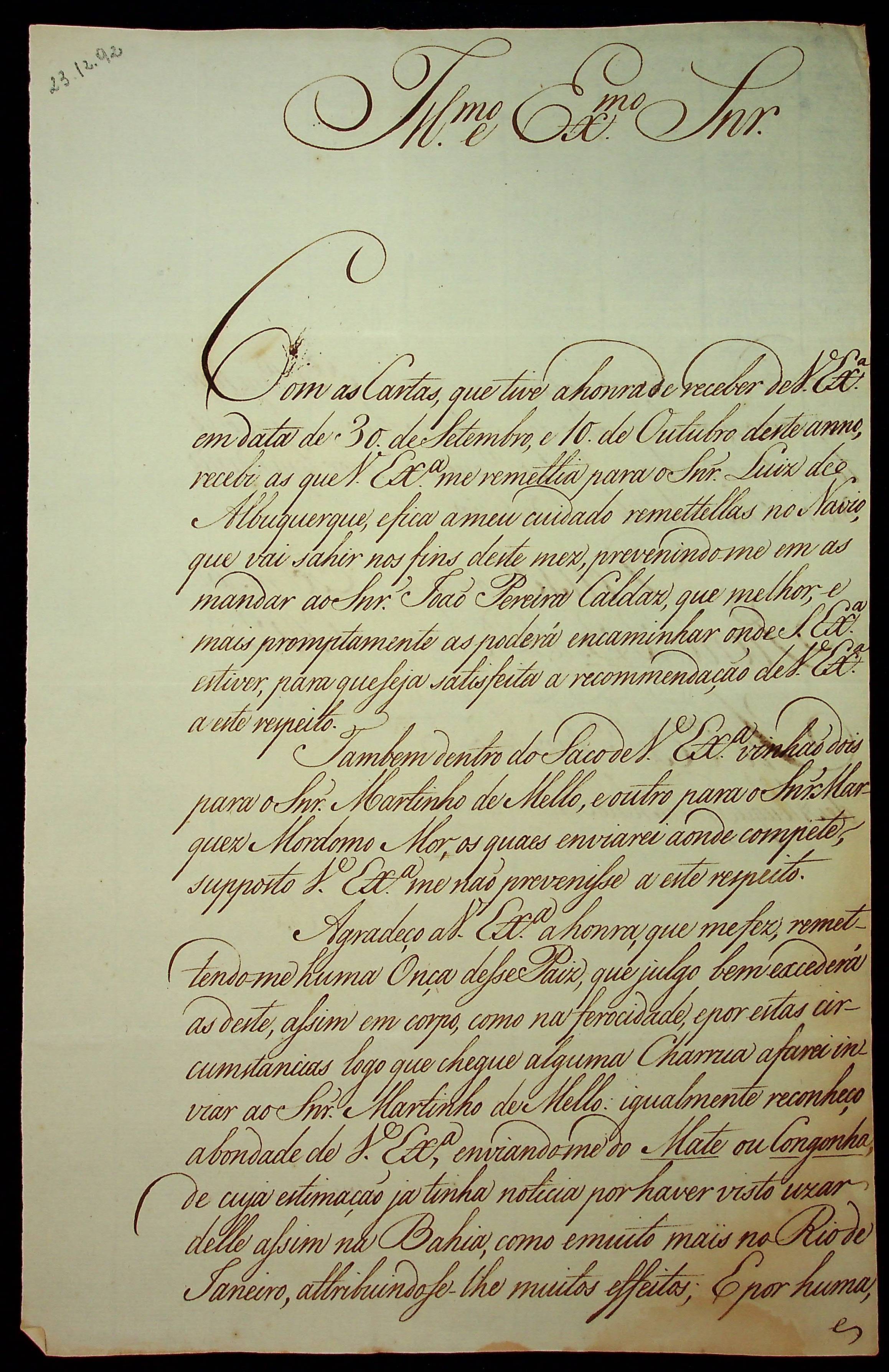 CARTA de Francisco de Souza Coutinho ao [Governador e Capitão-General da Capitania de Mato Grosso] João de Albuquerque de Mello Pereira e Cáceres.