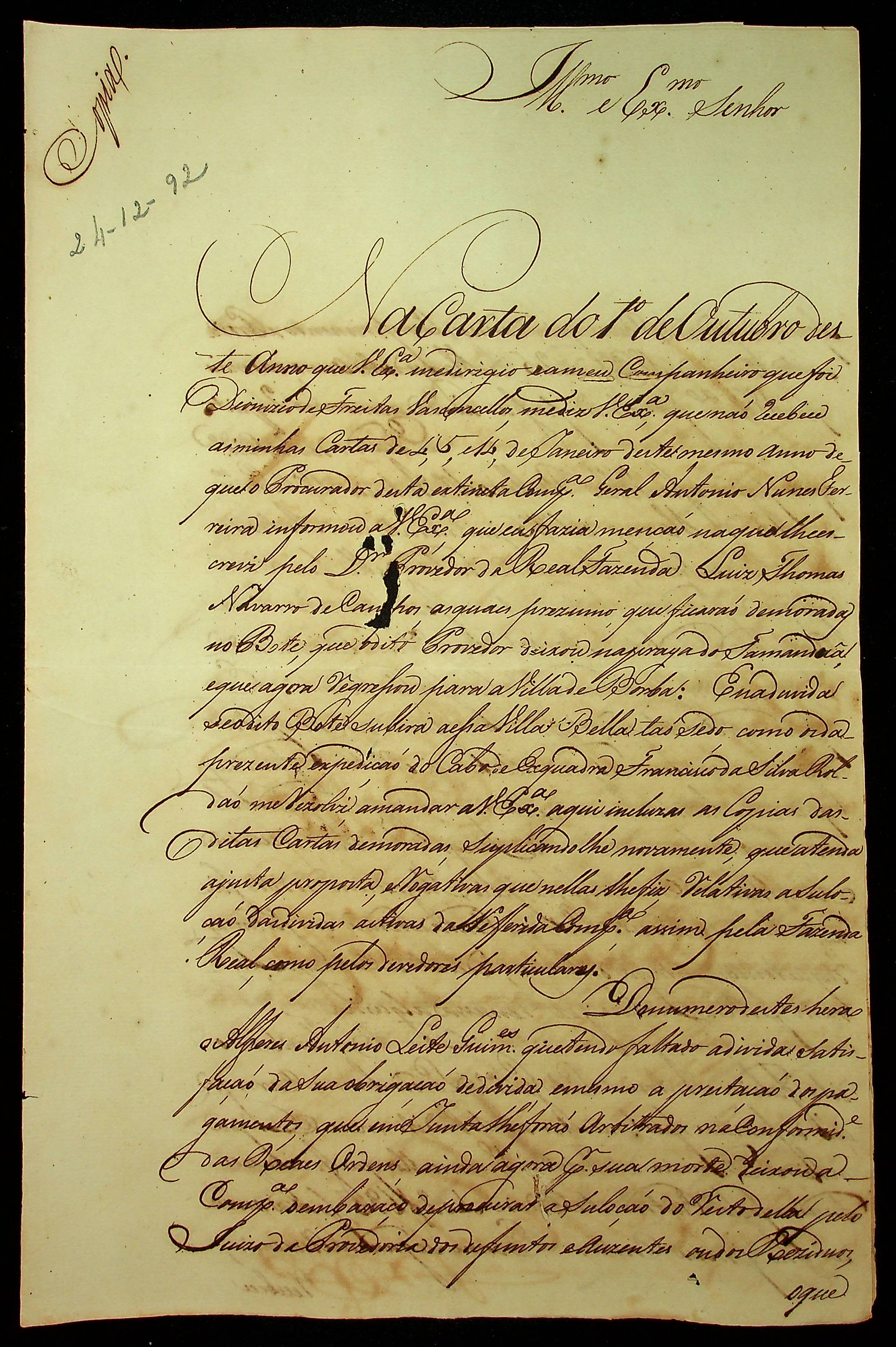 CARTA de Manoel José da Cunha ao [Governador e Capitão-General da Capitania de Mato Grosso] João de Albuquerque de Mello Pereira e Cáceres.