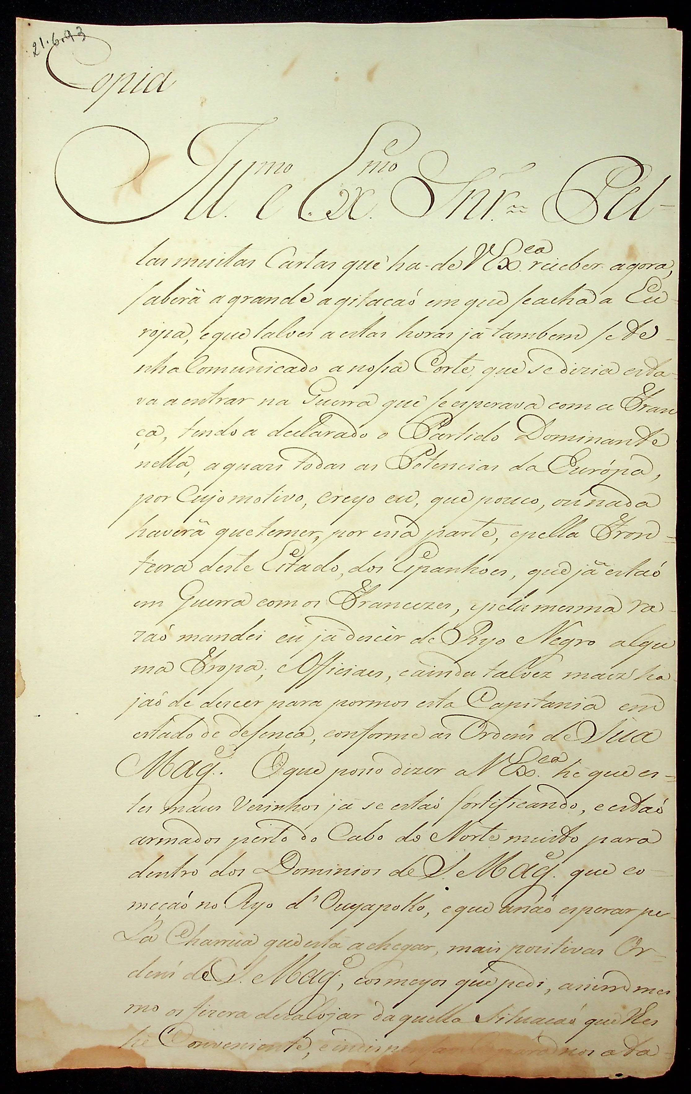 CARTA de Francisco de Souza Coutinho ao [Governador e Capitão-General da Capitania de Mato Grosso] João de Albuquerque de Melo Pereira e Cáceres.