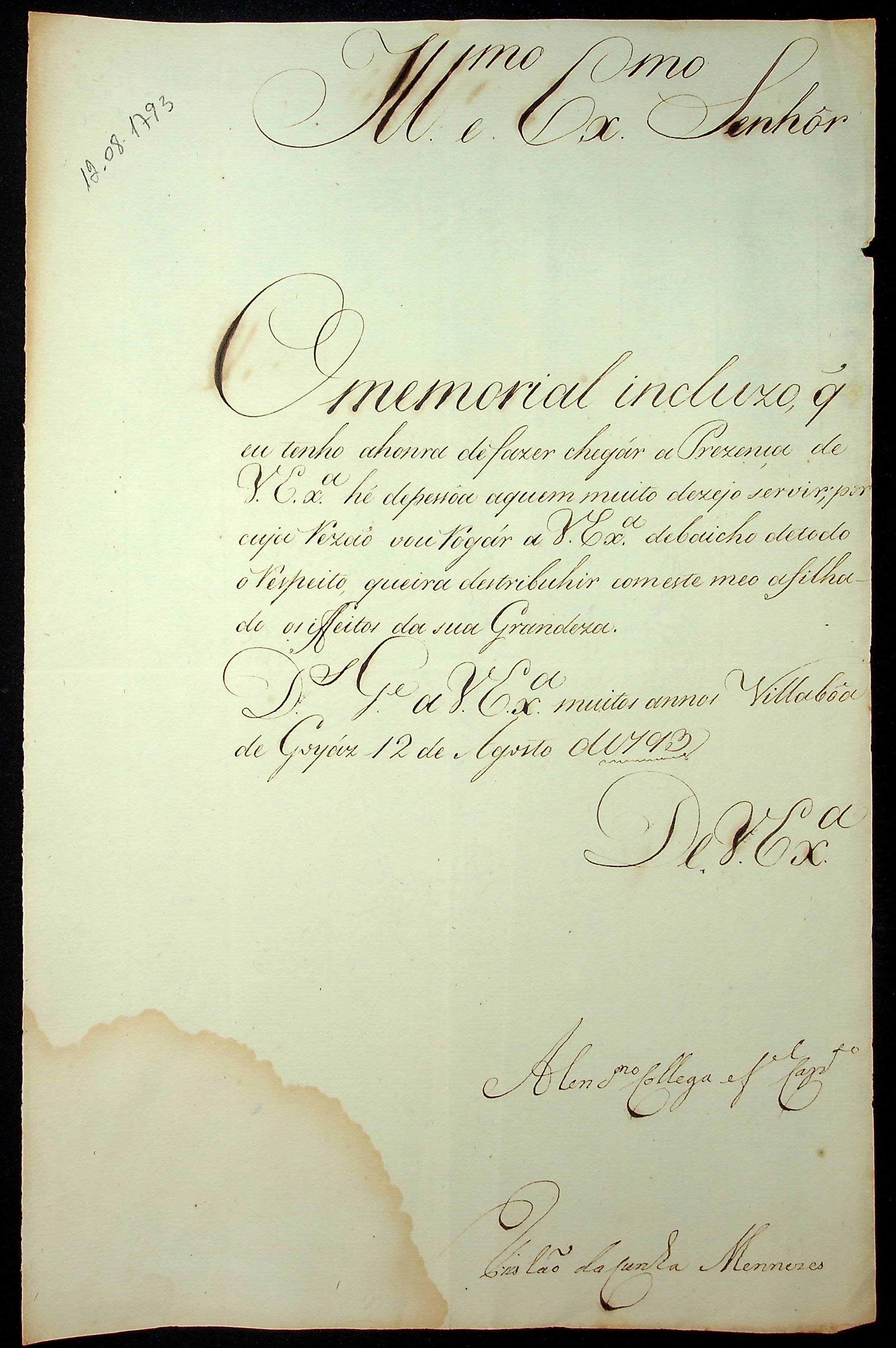CARTA de Tristão da Cunha Menezes ao [Governador e Capitão-General da Capitania de Mato Grosso] João de Albuquerque de Mello Pereira e Cáceres.