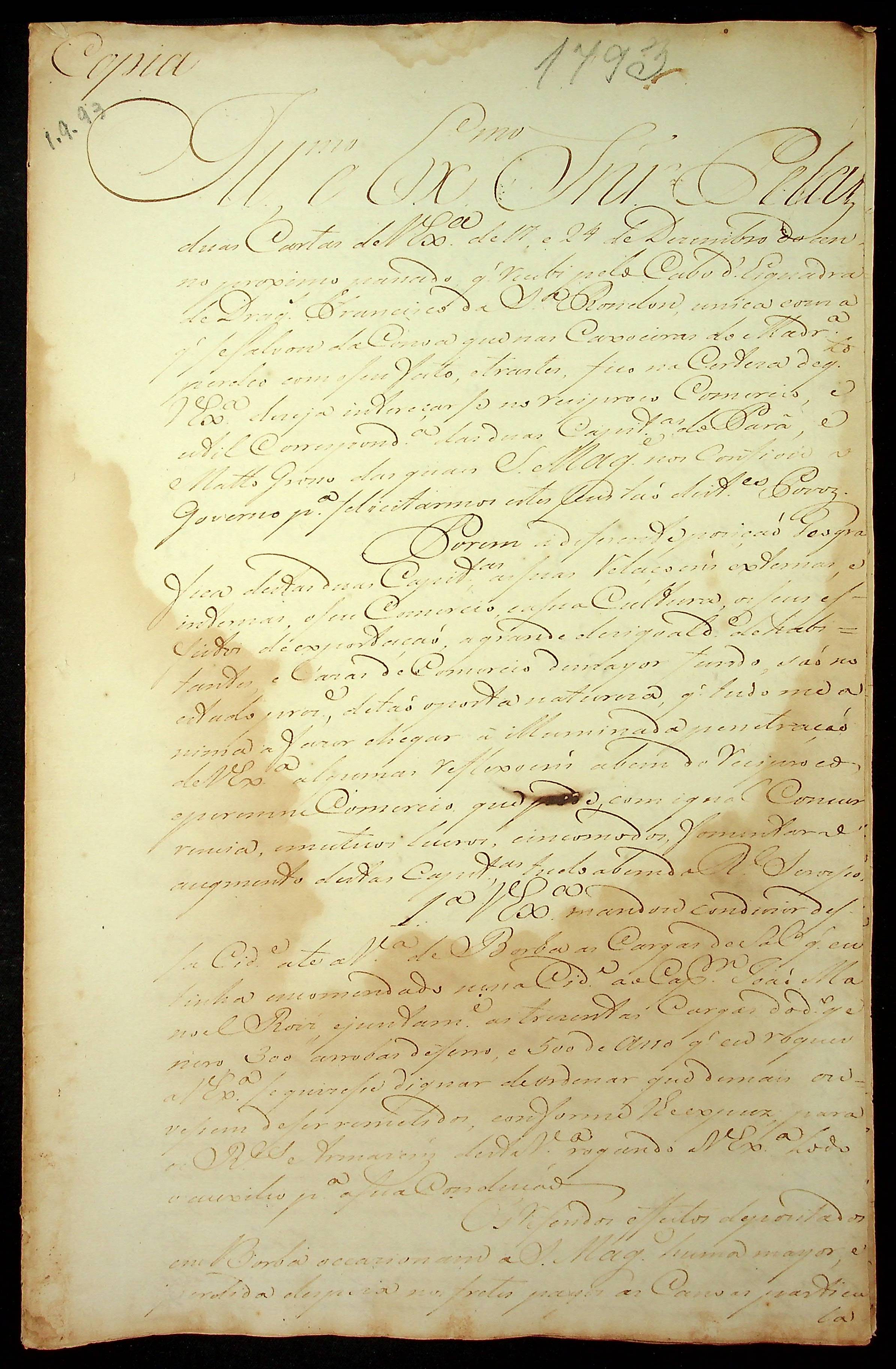 CARTA (cópia) do [Governador e Capitão-General da Capitania de Mato Grosso] João de Albuquerque de Mello Pereira e Cáceres ao [Governador e Capitão-General da Capitania do Pará] Francisco de Souza Coutinho.