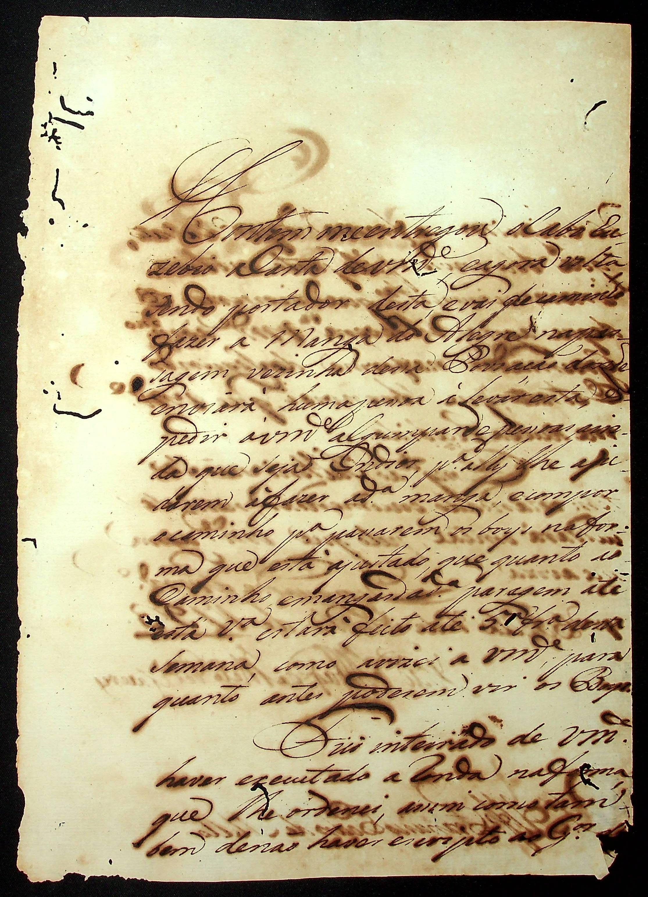 CARTA (Incompleto) do [Governador e Capitão General da Capitania de Mato Grosso] João de Albuquerque de Melo Pereira e Cáceres ao [Alferes] Francisco Pedro de Melo.