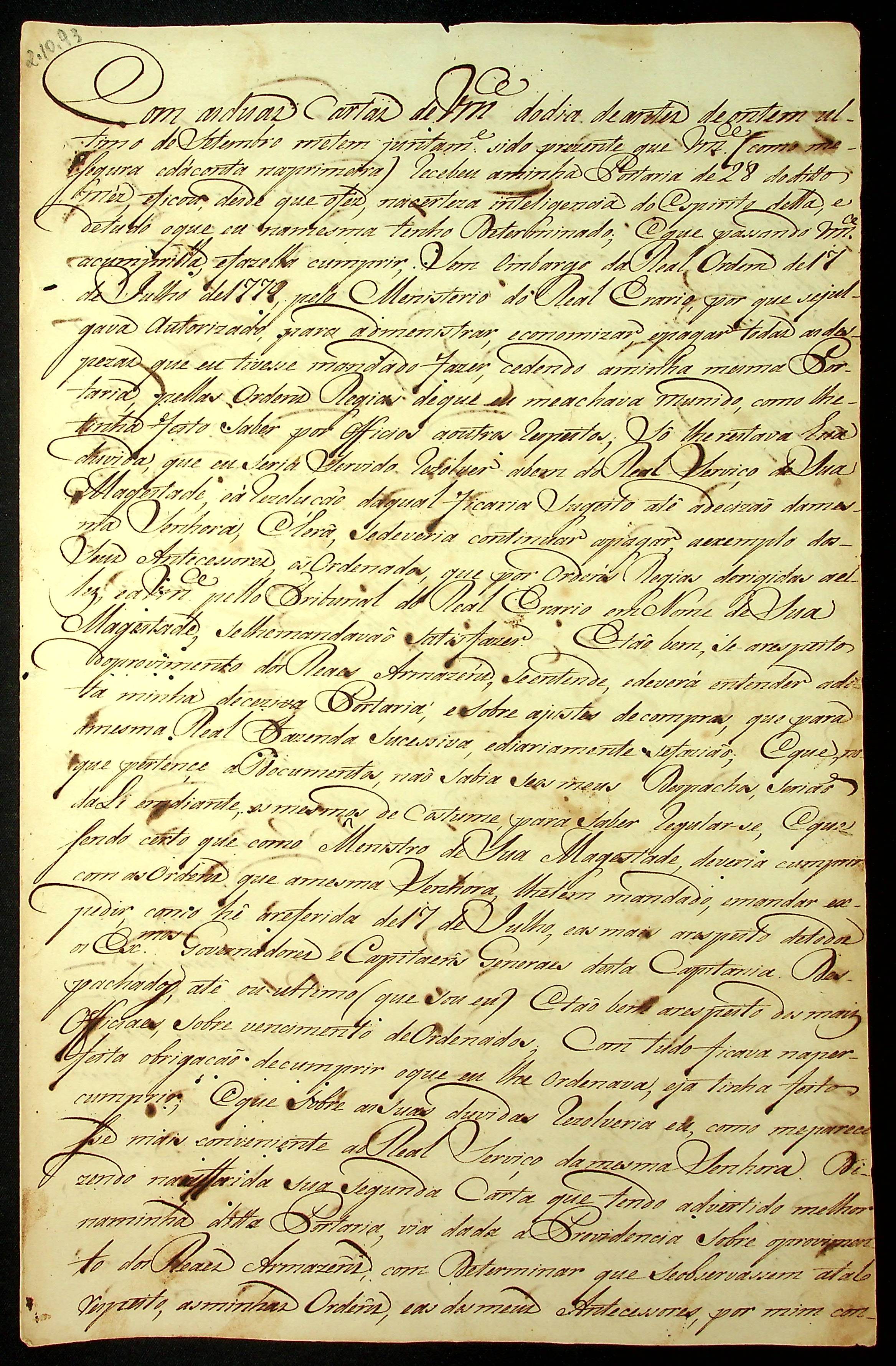 CARTA do [Governador e Capitão-General da Capitania de Mato Grosso] João de Albuquerque de Melo Pereira e Cáceres ao Provedor da Real Fazenda e Intendência do Ouro da Capitania de Mato Grosso Luís Thomaz Navarro de Campo.