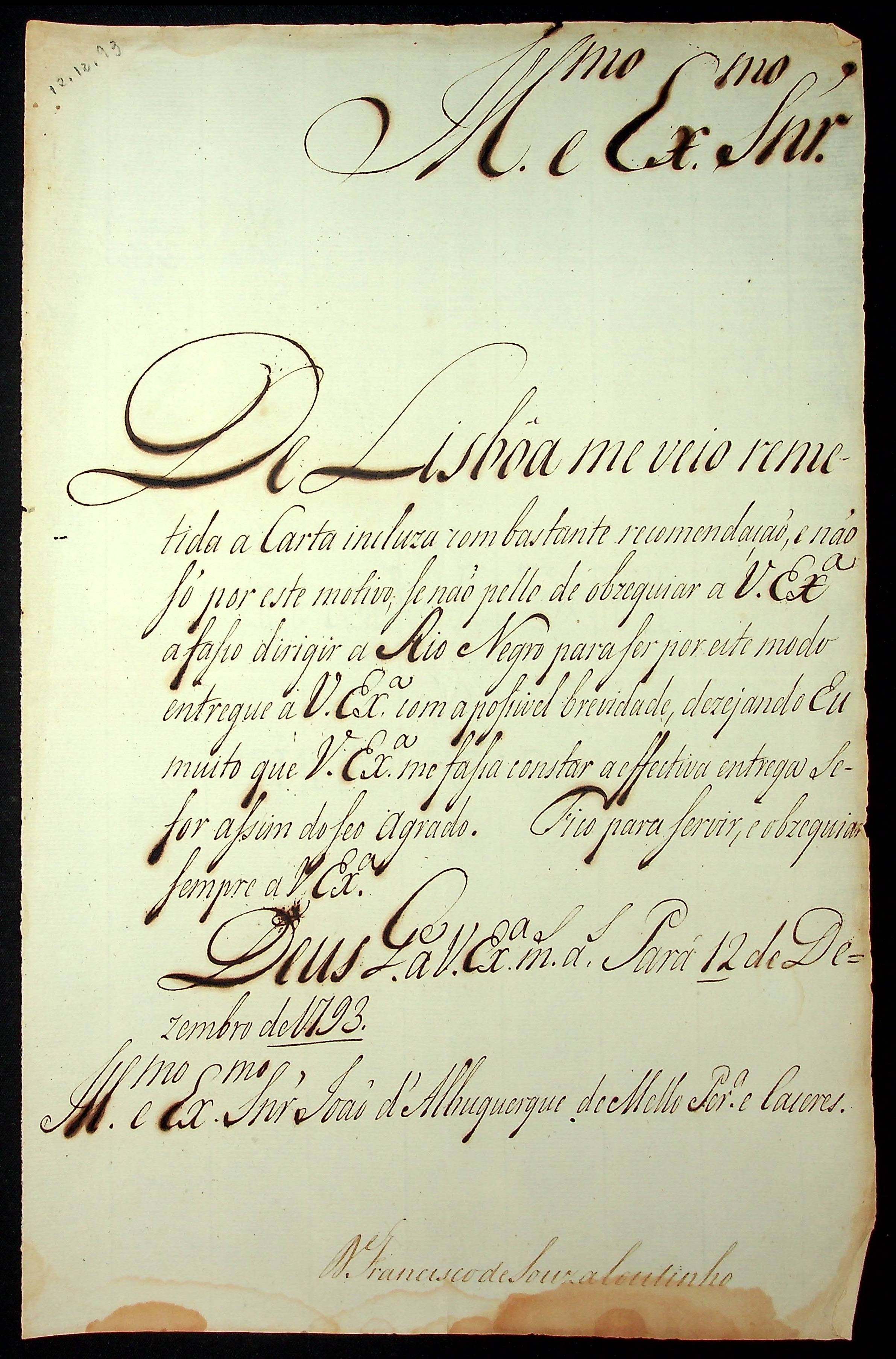 CARTA do [Governador e Capitão-General da Capitania do Pará] Francisco Souza Coutinho ao Governador e Capitão-General da Capitania de Mato Grosso João de Albuquerque de Melo Pereira e Cáceres.